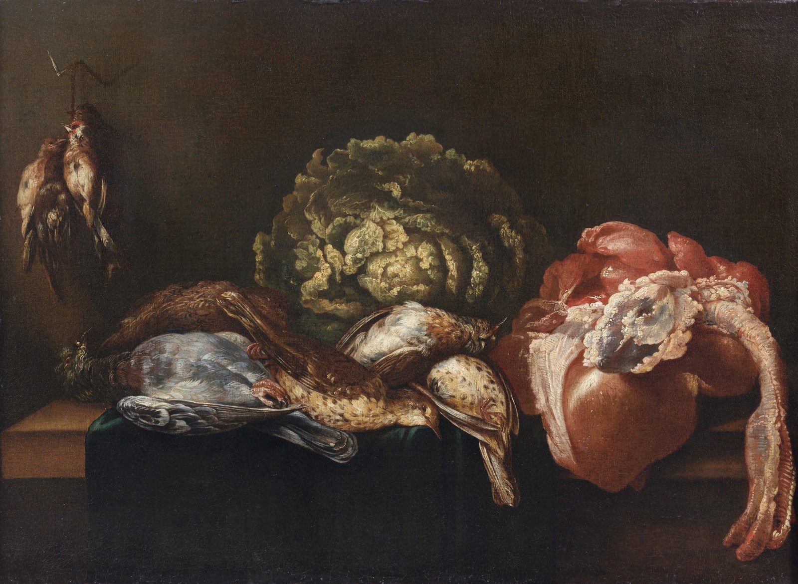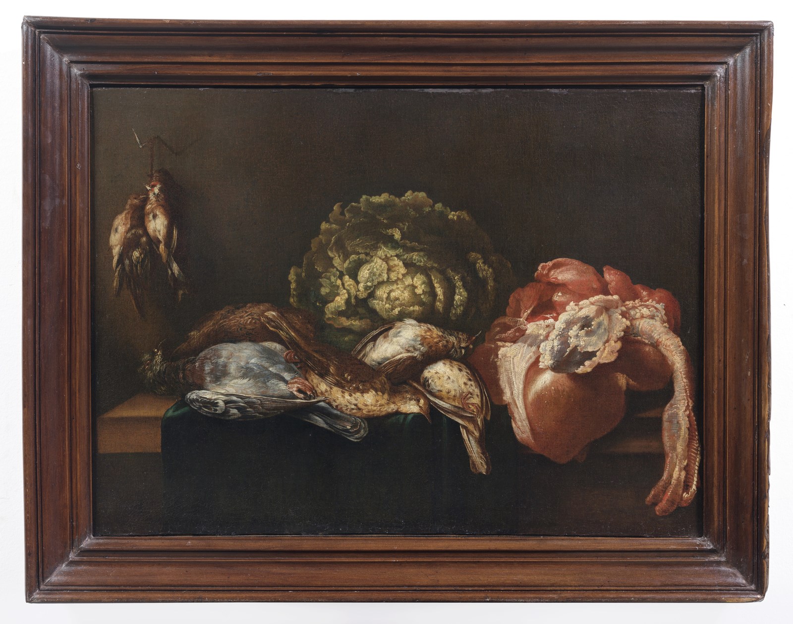 VAN DER KERCKHOVEN JACOB (1636 - 1712) - Attribuito a. Natura morta con cacciagione, cavolo e interiora.