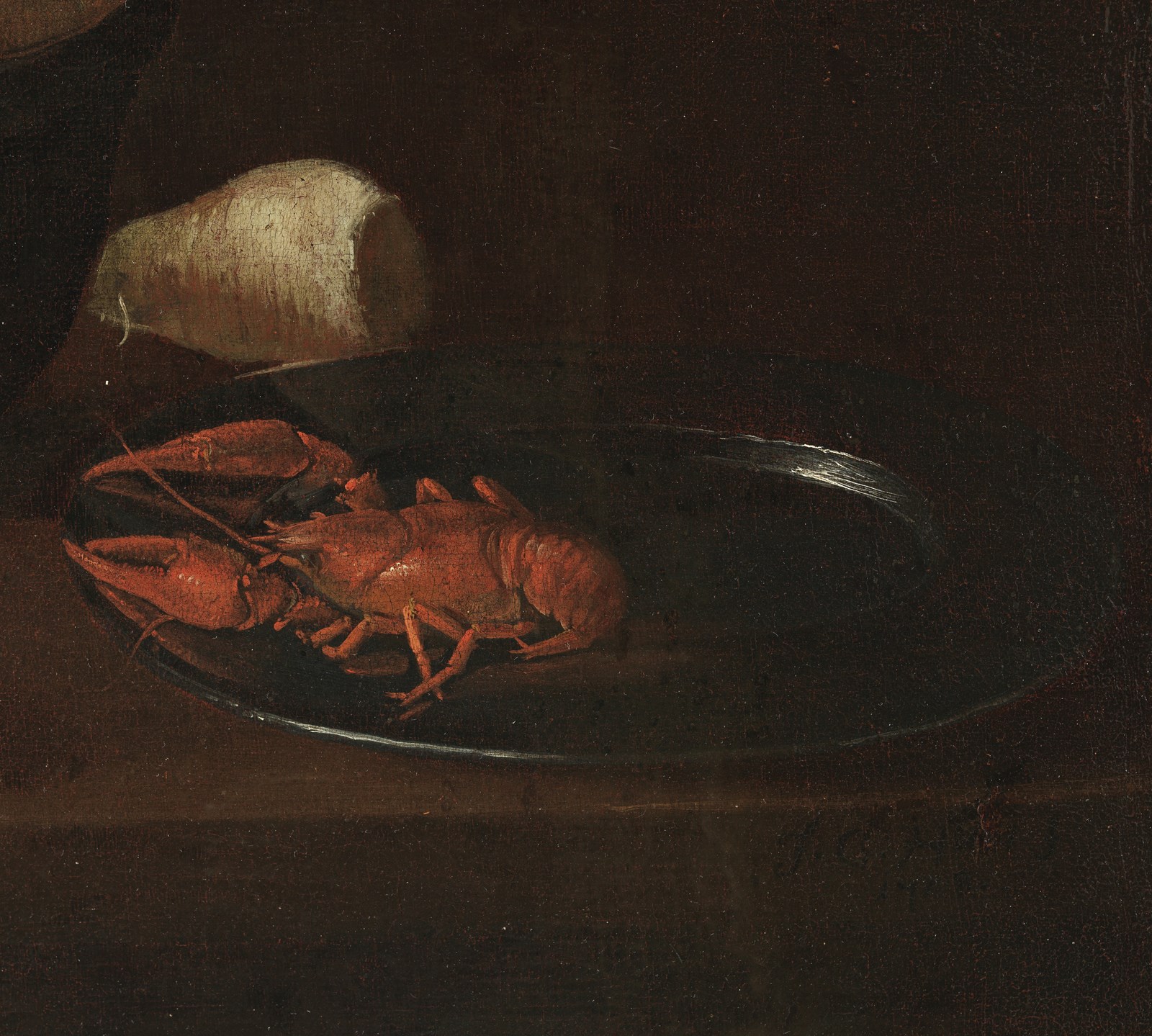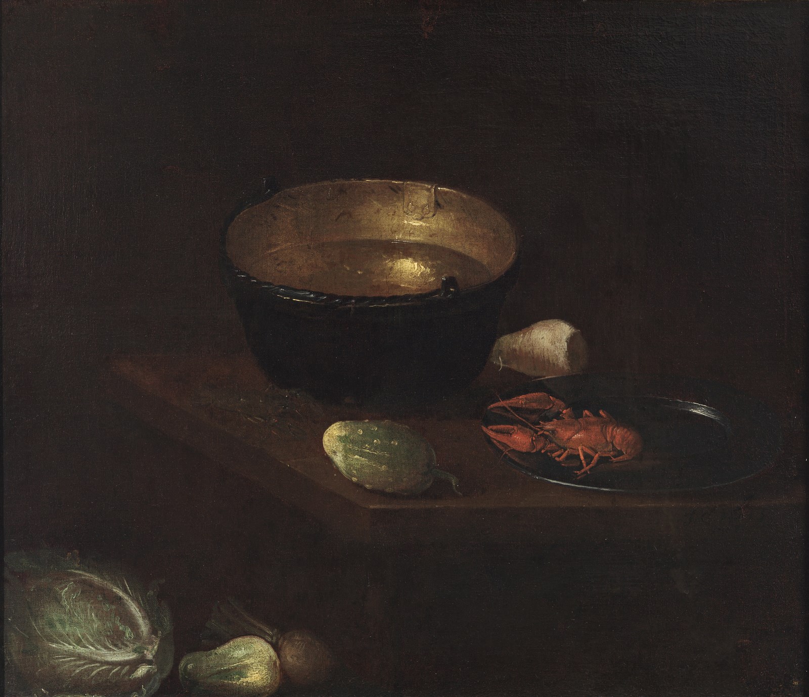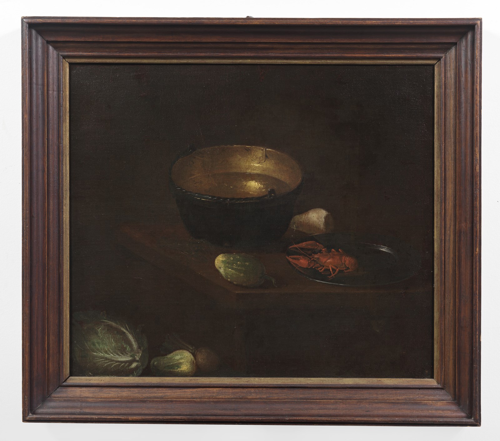 J. C. HUN (XVII-XVIII SECOLO) Natura morta con verdura e gambero. Olio su tela . Cm 75,80 x 65,80. Firmato e datato "J.C. Hun 1708" sul tavolo.
