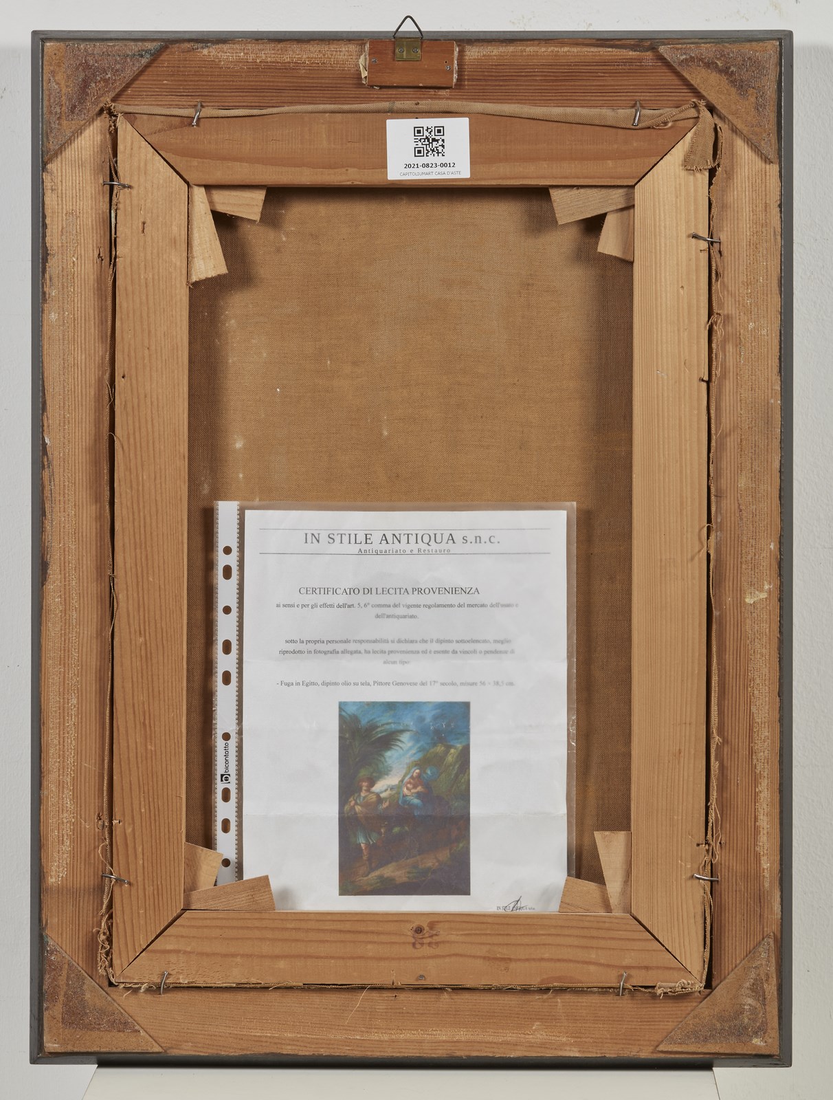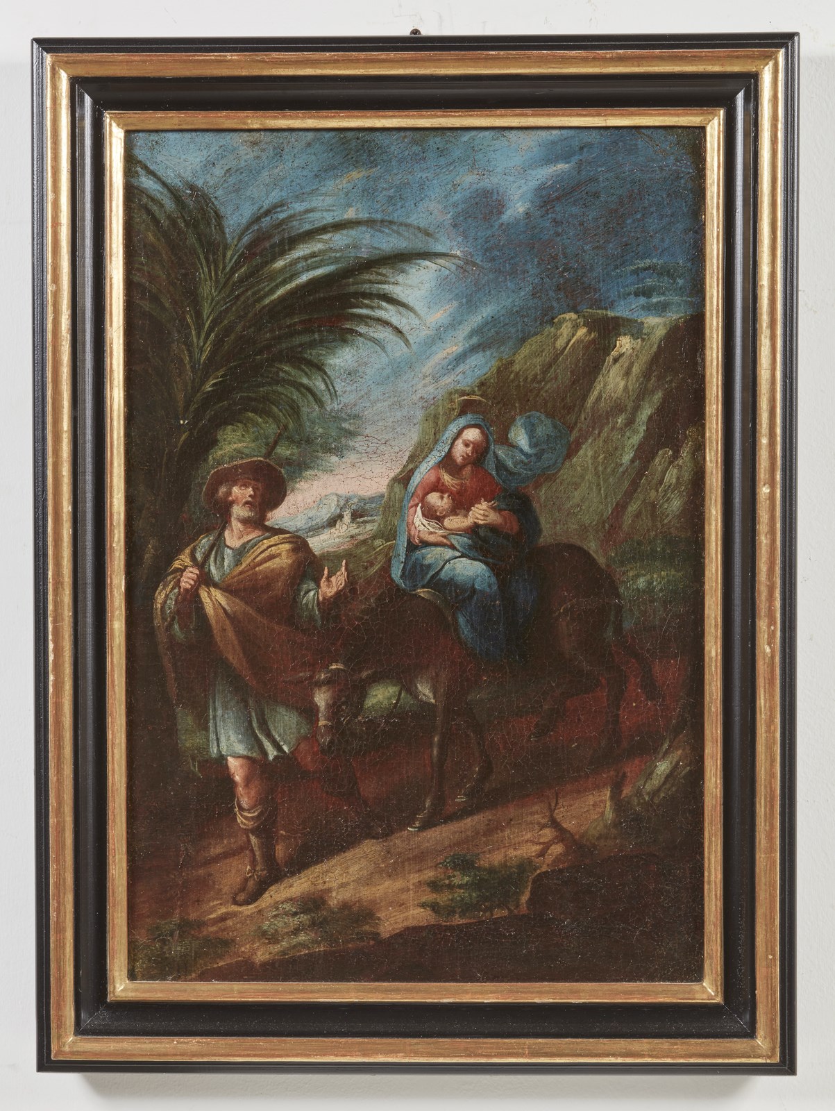 SCUOLA GENOVESE DEL XVIII SECOLO Fuga in Egitto. Olio su tela . Cm 38,00 x 57,00. . Cornice presente