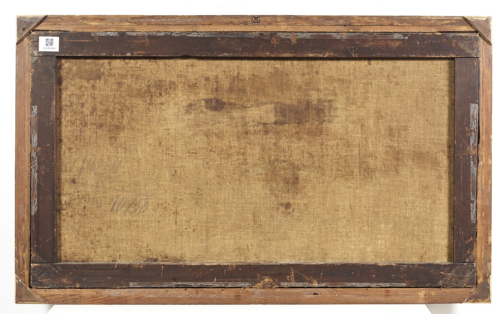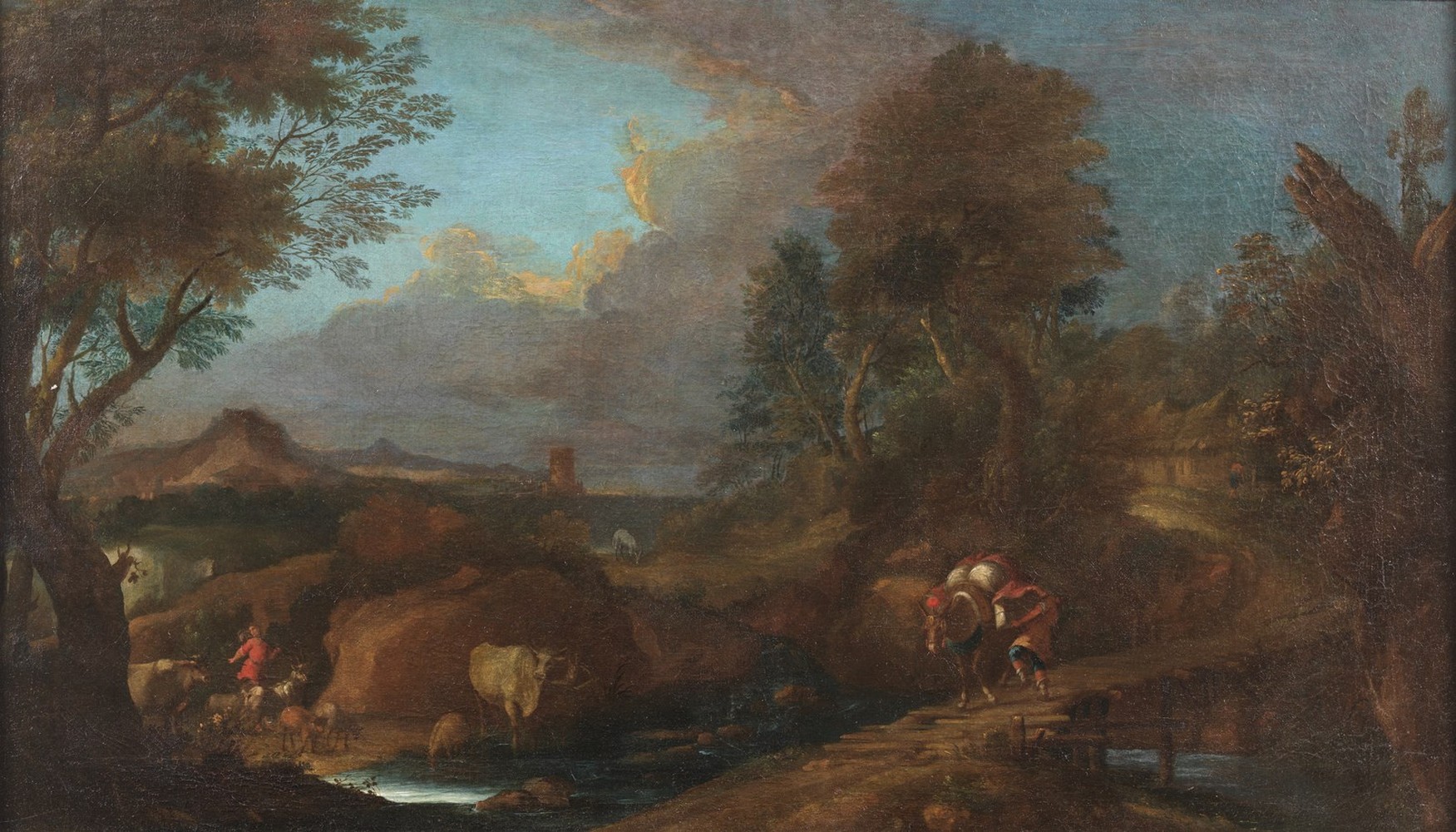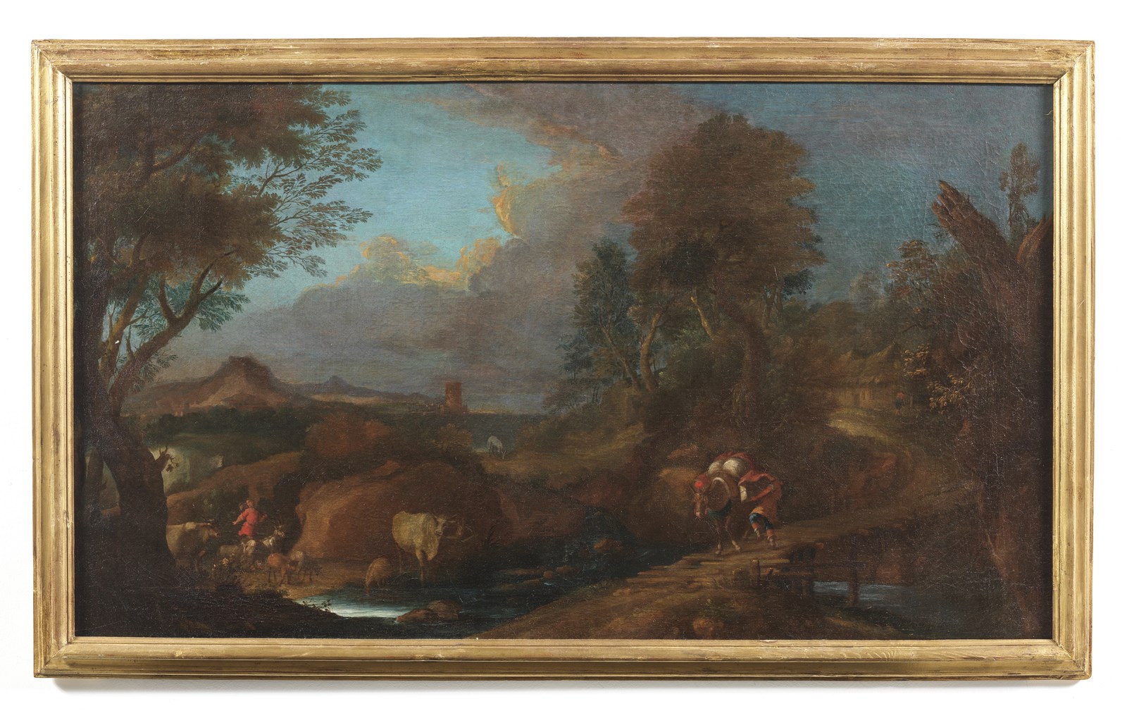 ARTISTA BRESCIANO DEL XVIII SECOLO Paesaggio con personaggi. . Olio su tela . Cm 121,00 x 69,00. . Cornice presente