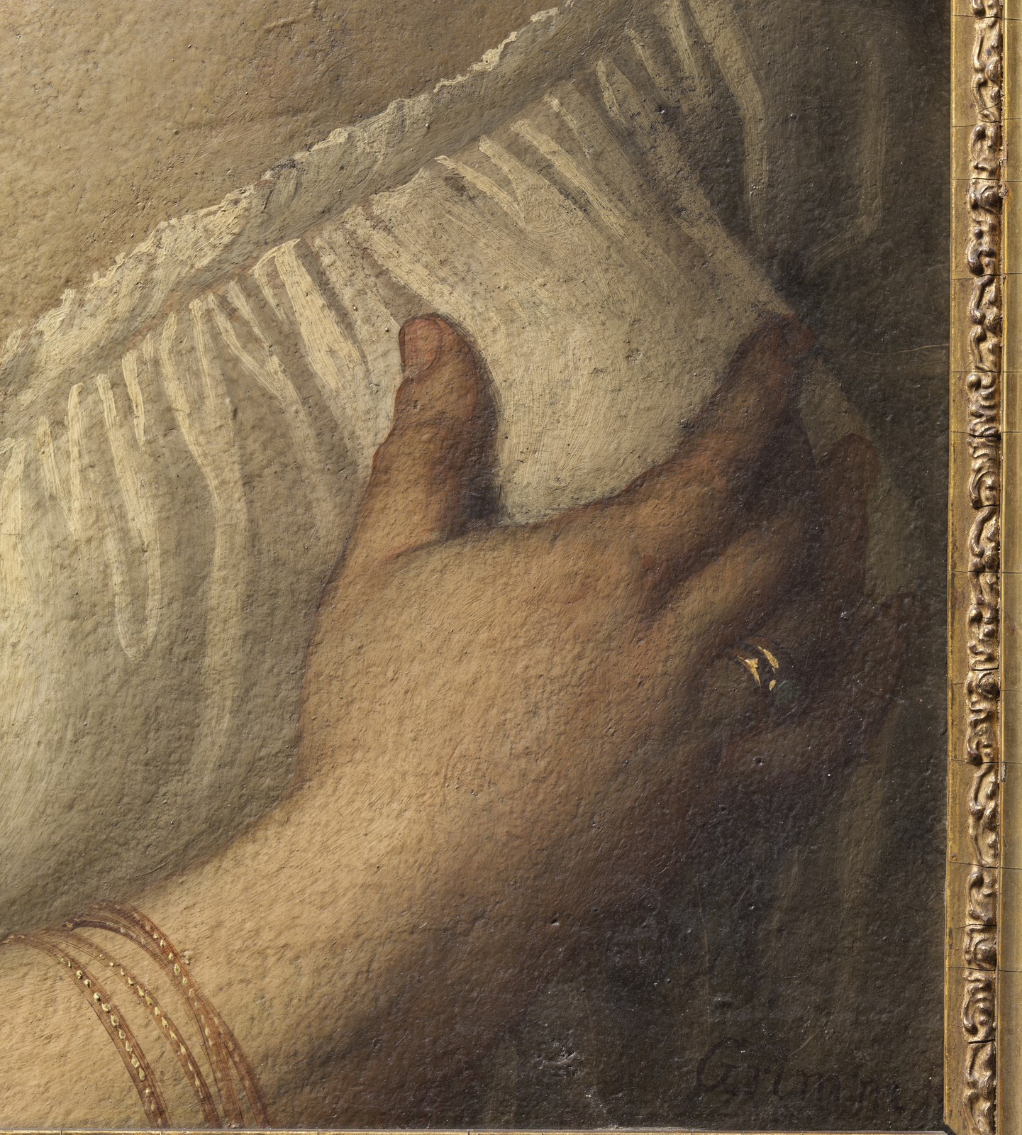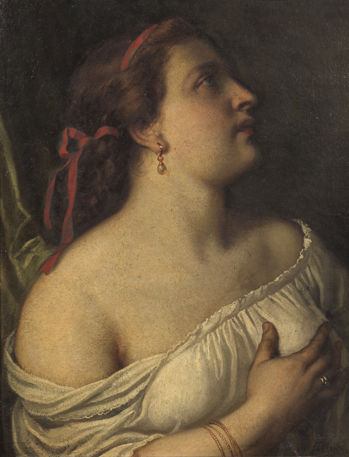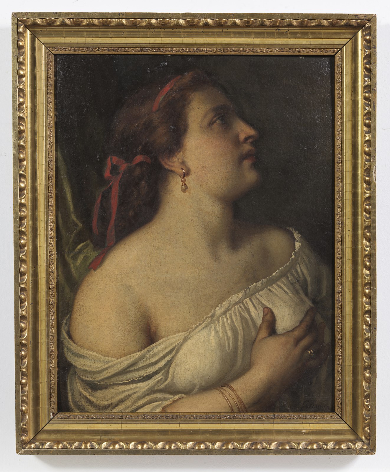 ARTISTA DEL XVIII-XIX SECOLO Ritratto di donna. Olio su cartone pressato. Cm 50,50 x 65,00. . Cornice presente