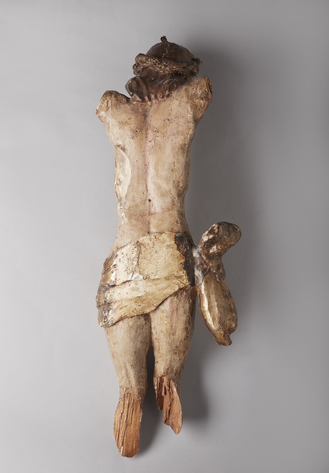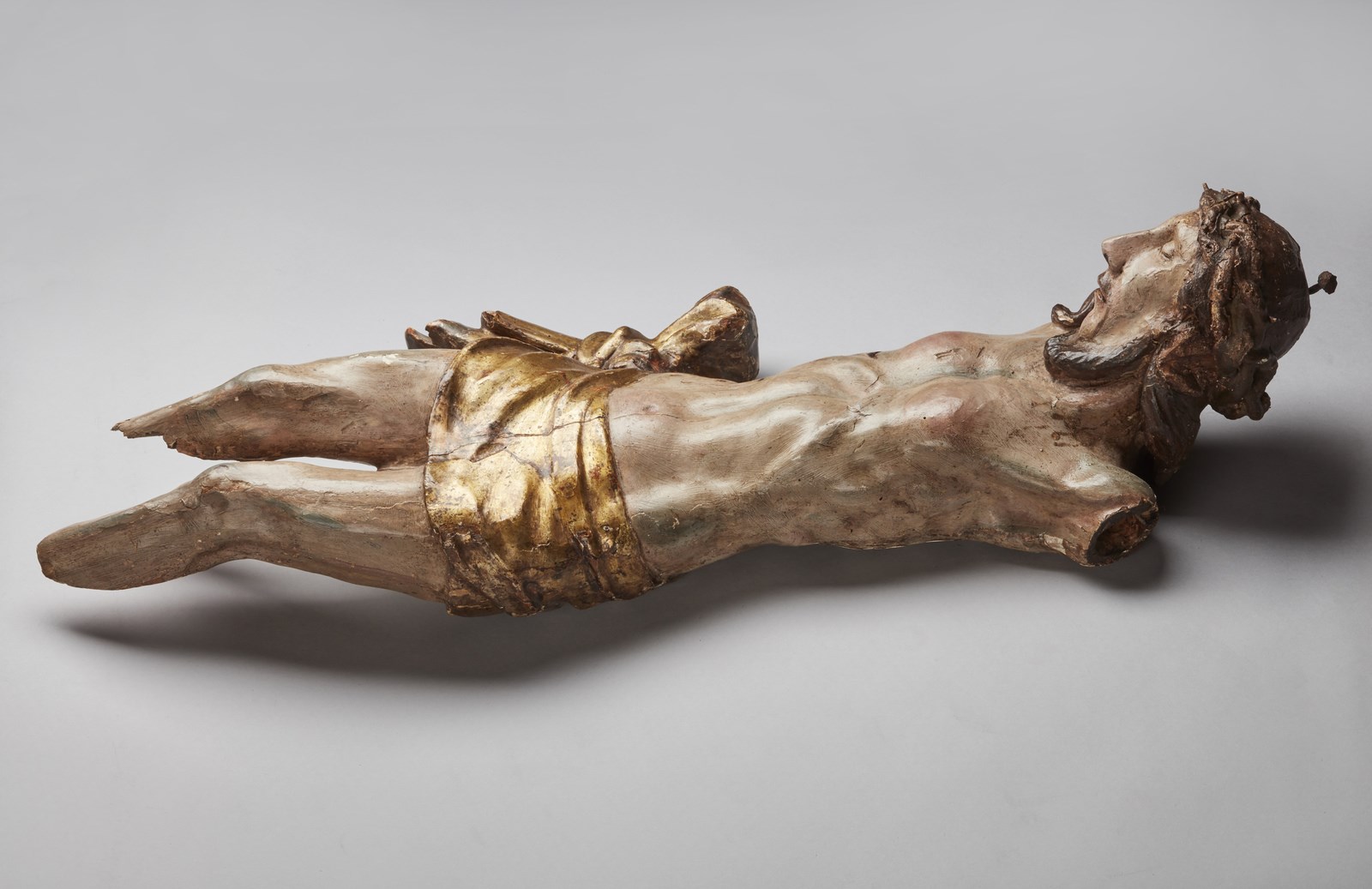 SCULTORE DEL XVI-XVII SECOLO Corpus Christi in legno policromo e parzialmente dorato. . Cm 25,00 x 72,00 x 14,00. Difetti e mancanze.