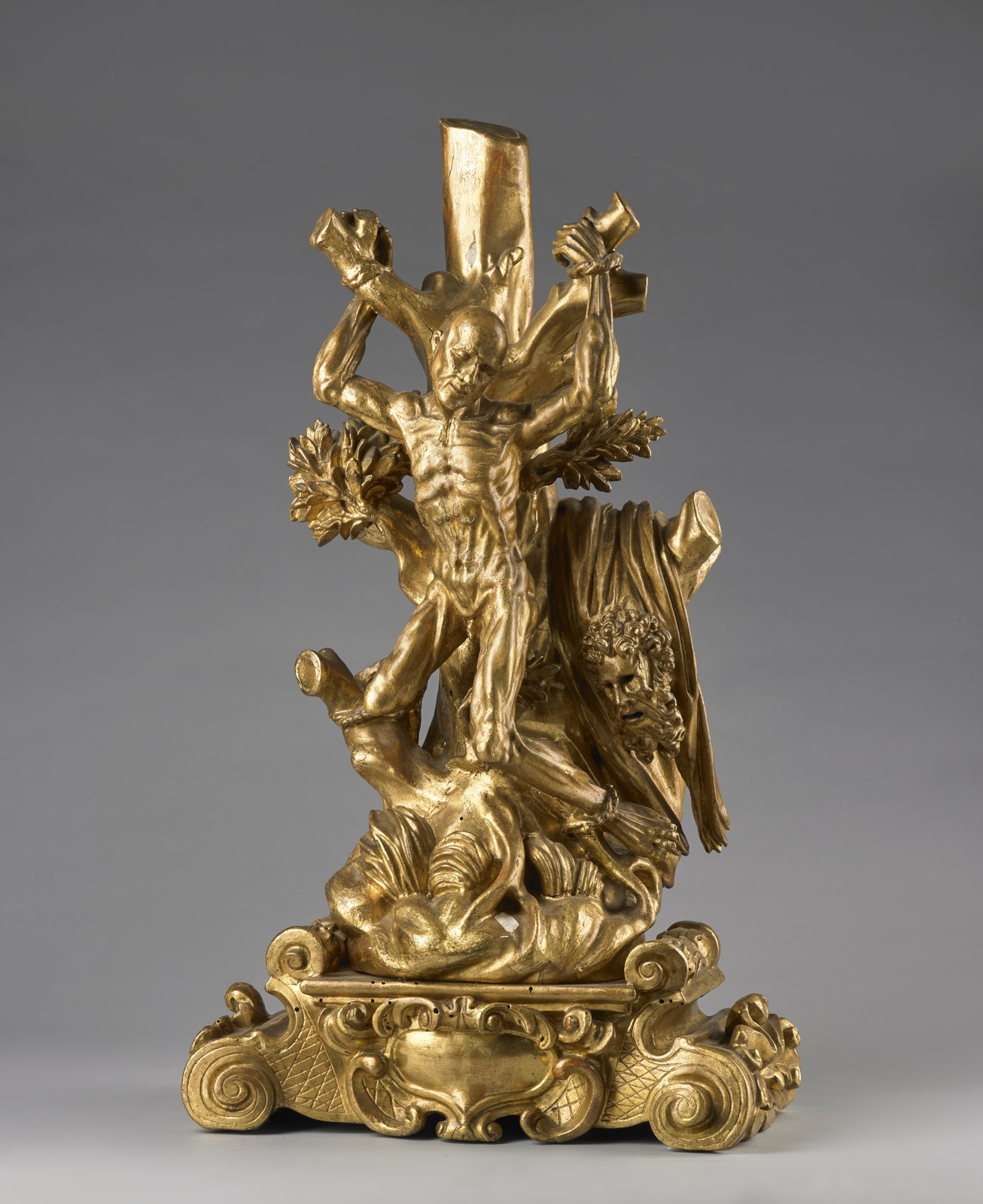 SCULTORE DELL'ITALIA SETTENTRIONALE DEL XVII-XVIII SECOLO San Bartolomeo. legno dorato e intagliato. Cm 33,00 x 60,00 x 21,00. Minime mancanze e ridorature.