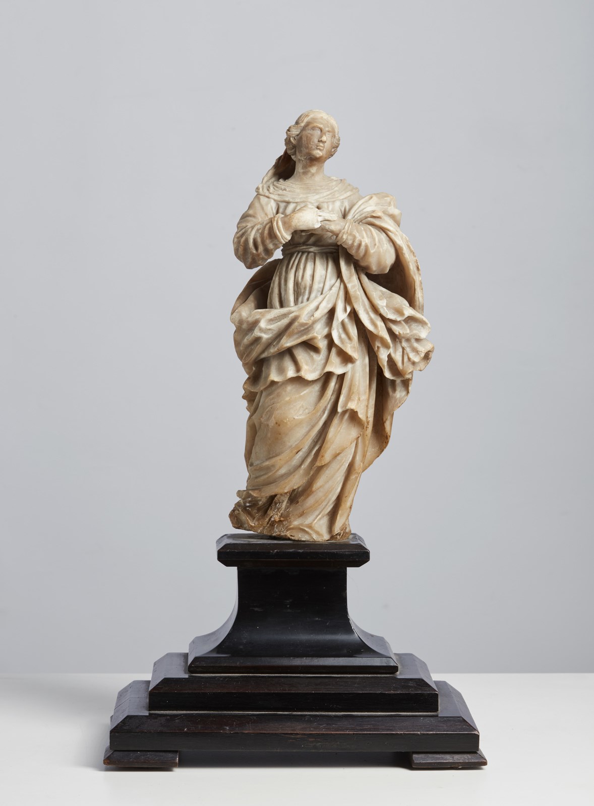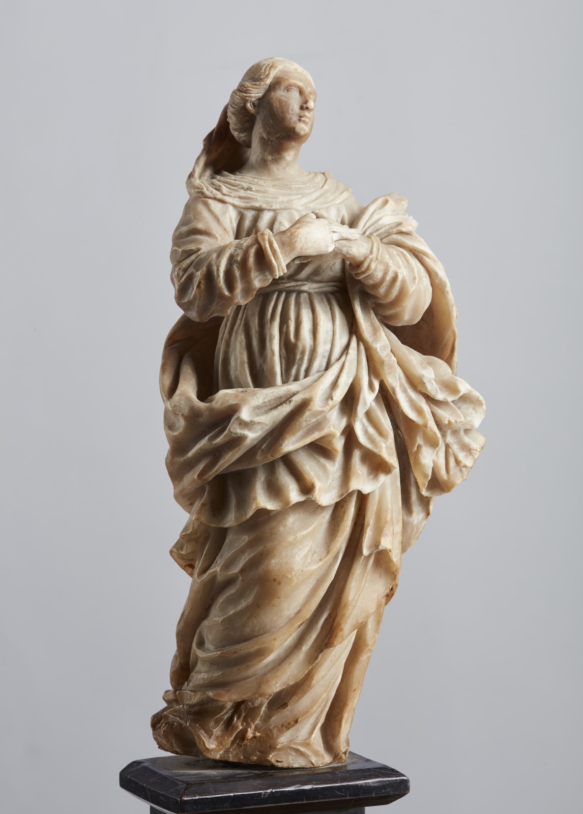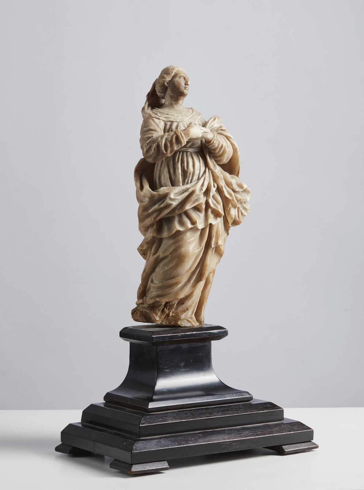MANIFATTURA SICILIANA DEL XVIII SECOLO Immacolata Concezione. Alabastro. Cm 14,00 x 24,50 x 4,00. Difetti e mancanze. Altezza complessiva: 36 cm.