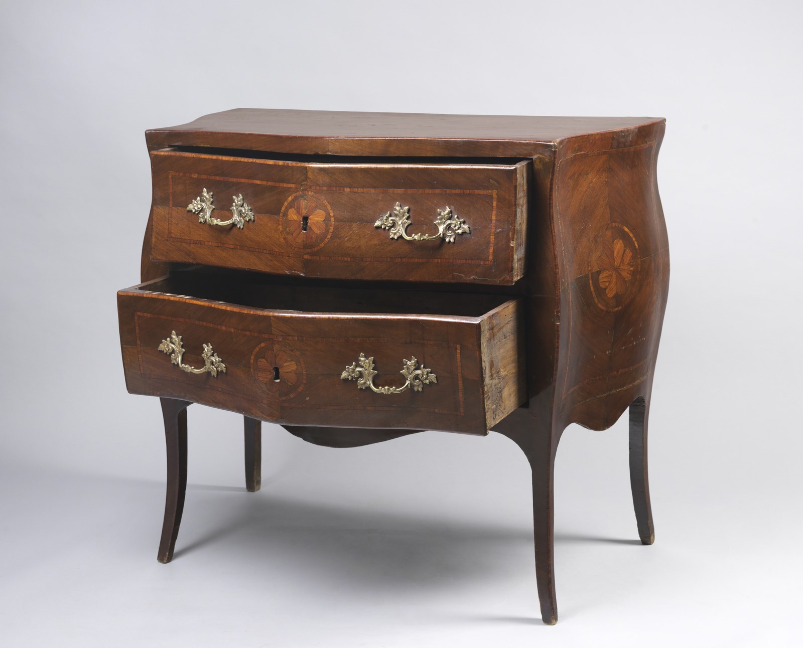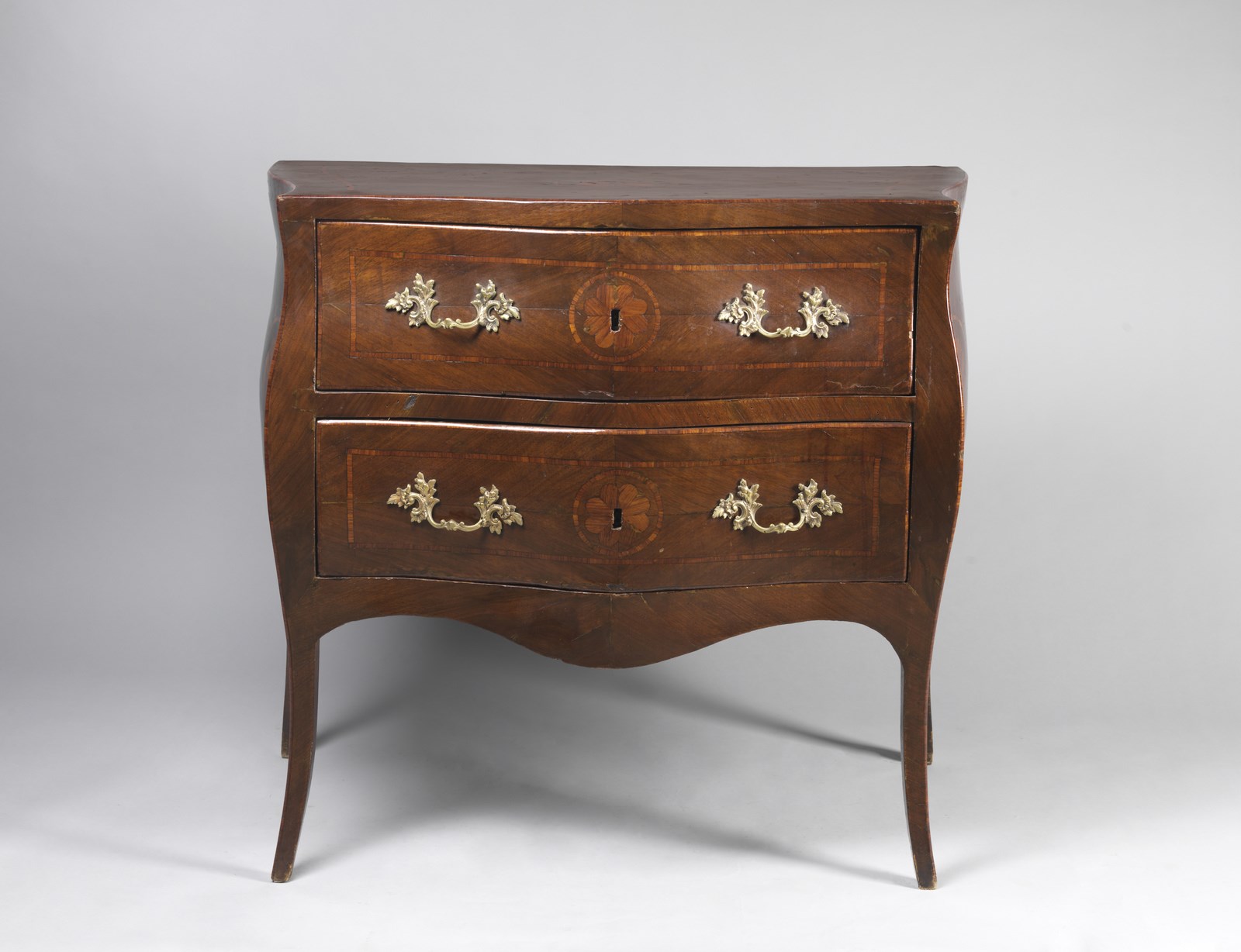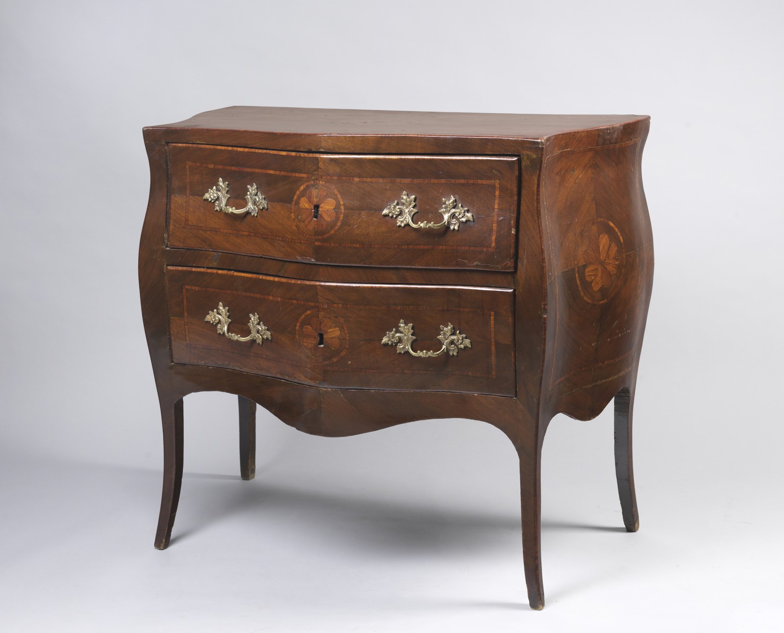 MANIFATTURA NAPOLETANA DEL XVIII SECOLO - Cassettone lastronato in palissandro e filettato in bois de rose e bois de violette, due cassetti sul fronte, gambe arcuate.