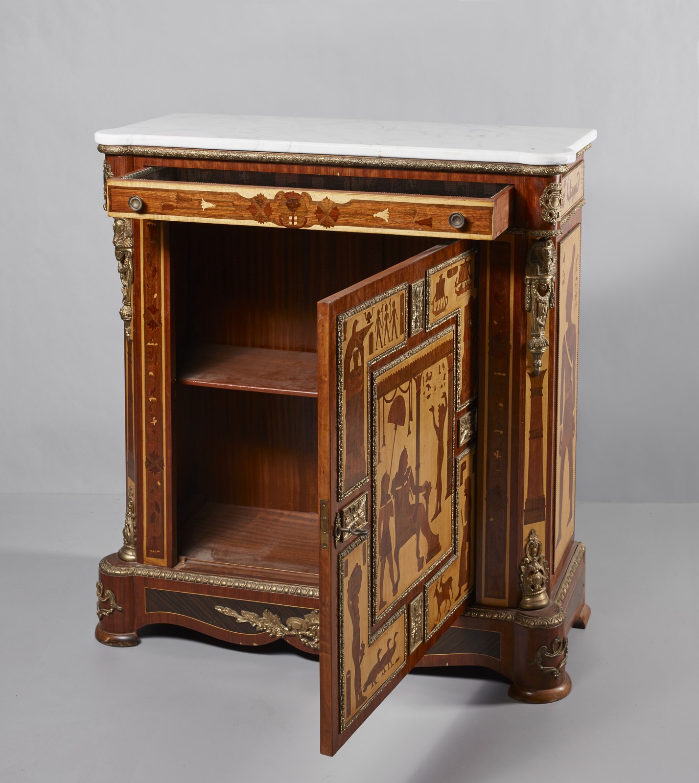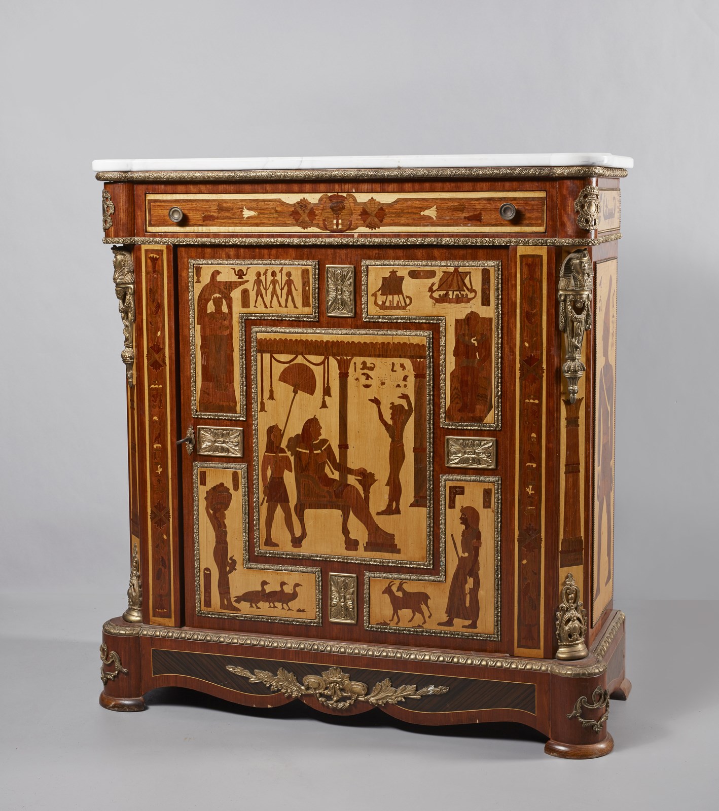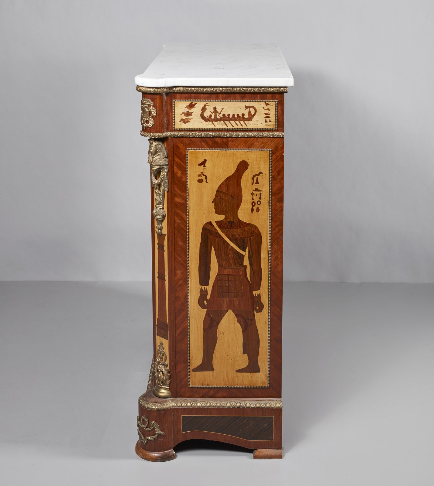 MANIFATTURA FRANCESE DEL XIX SECOLO - Commode in mogano e altre essenze con intarsi all'Egizia e piano in marmo bianco, decorazioni in bronzo dorato.