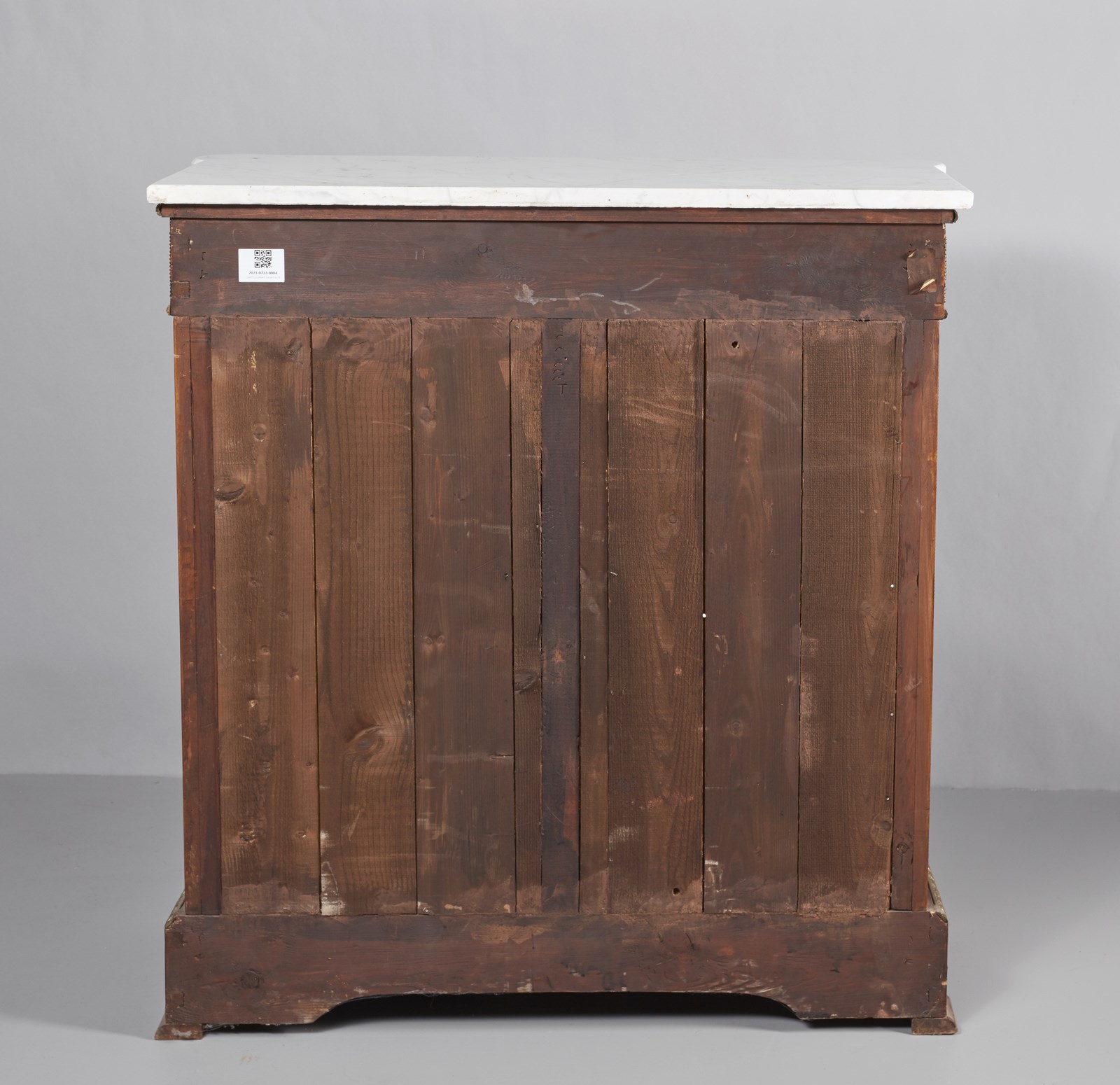 MANIFATTURA FRANCESE DEL XIX SECOLO Commode in mogano e altre essenze con intarsi all'Egizia e piano in marmo bianco, decorazioni in bronzo dorato. . Cm 94,20 x 105,50 x 39,50.