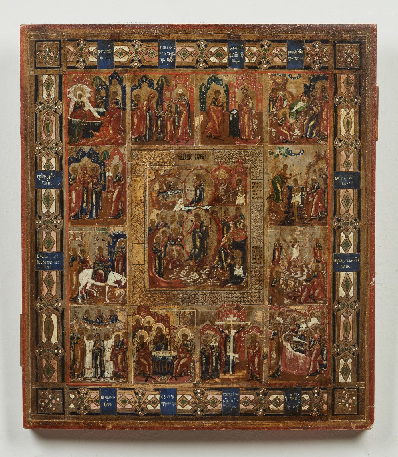 ICONA RUSSA DEL XIX SECOLO Le dodici feste. . Tempera su tavola. Cm 31,00 x 35,50. L'opera è accompagnata da expertise a cura di Mag. Franz Lessner.