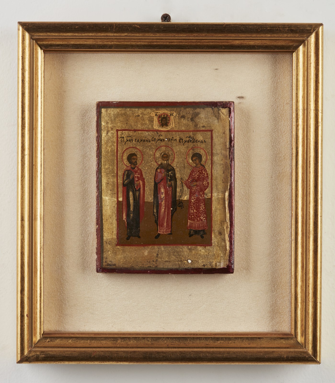 ICONA RUSSA DEL XIX SECOLO Santi scelti e Cristo Acheropita. Tempera su tavola. Cm 10,50 x 13,50. . Cornice presente