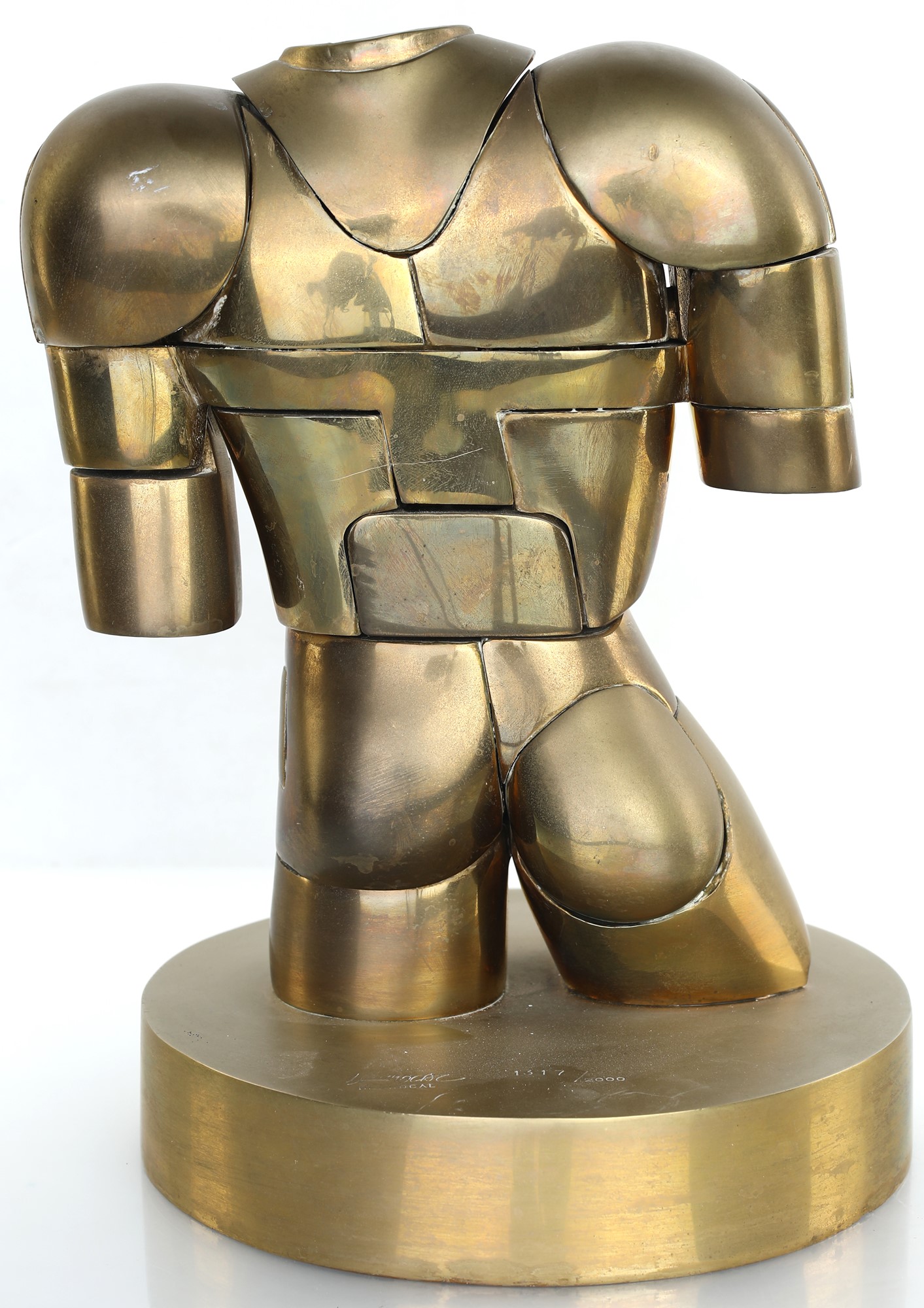 Scultura in ottone su base in ferro a putrella, cm 28x22x20