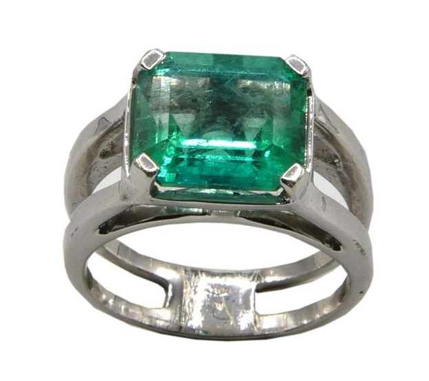 in oro bianco 18kt, con al centro smeraldo colombiano naturale, taglio rettangolare compositio di 4,78 ct circa.