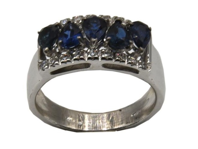 ANELLO CON ZAFFIRI E DIAMANTI in oro bianco 18kt, e cinque zaffiri blu...