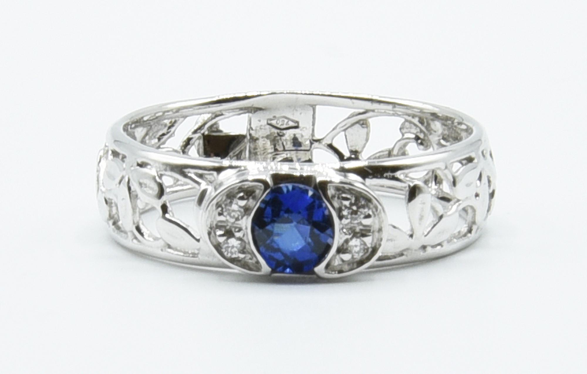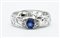 in oro bianco 18kt, a fascia traforata e modellata a foglie, con al centro zaffiro naturale blu di 0,49 ct circa e circondato da diamanti per complessivi 0,04 ct circa.