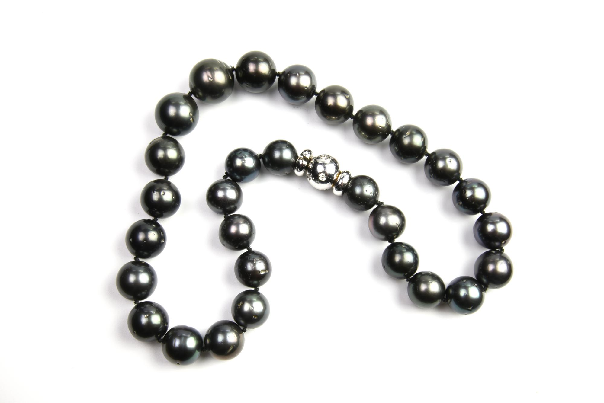 ad un filo di perle coltivate, grigie Tahiti degradrè, di 12-15,5 mm, fermatura a sfera e distanziali in oro bianco 18kt, impreziosita da diamanti taglio brillante, per 0,16 ct circa.