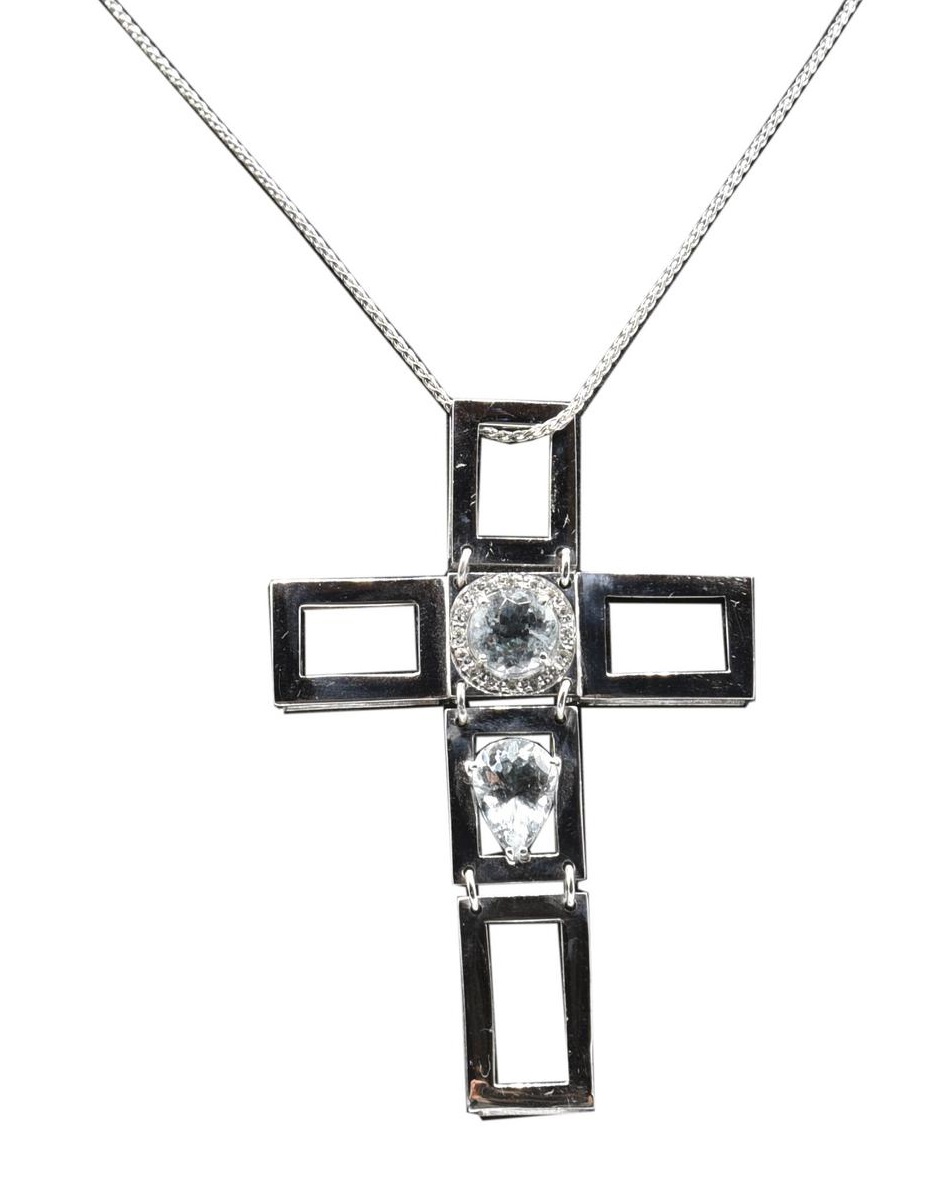 PENDENTE A CROCE CON ACQUAMARINA E DIAMANTI in oro bianco 18kt, con al centro...