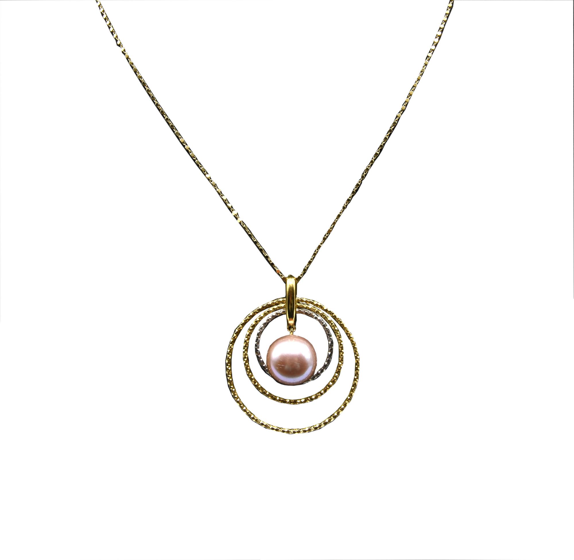 in oro bicolore 18kt a cerchi concentrici con perla coltivata South Sea rosa di 14,5 mm e catenina in oro giallo 18kt.