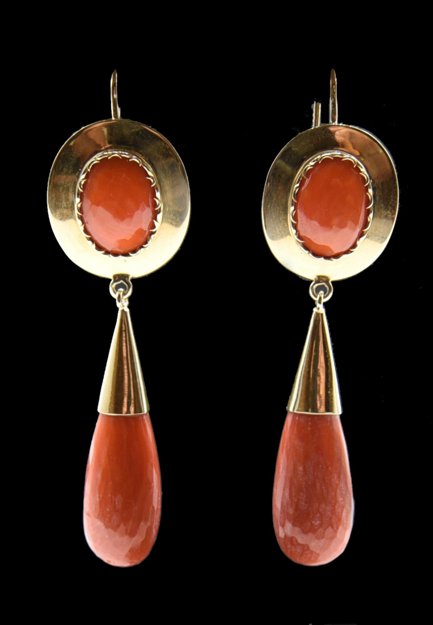 PAIO DI ORECCHINI PENDENTI CON CORALLO in oro giallo 18 kt con gocce e spole...