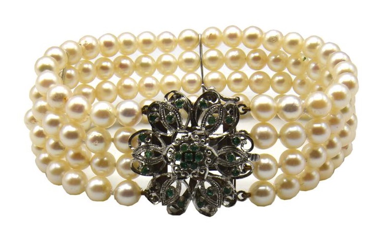 a quattro fili di perle giapponesi coltivate, di 6 mm, con preziosa chiusura in oro bianco 18kt, impreziosita da smeraldi naturali taglio rotondo, per 0,24 ct circa.
