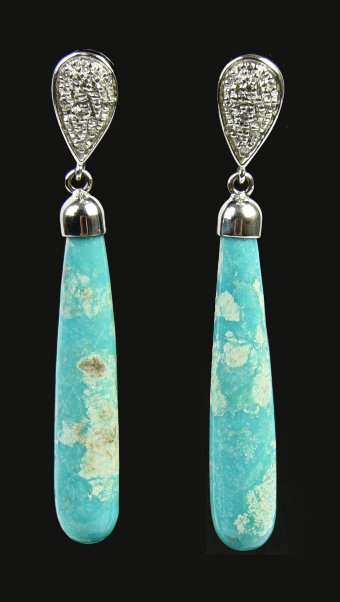 in oro bianco 18kt, con due turchesi persiani a goccia, di 4,90 gr. circa, e pavè di diamanti per 0,20 ct circa.