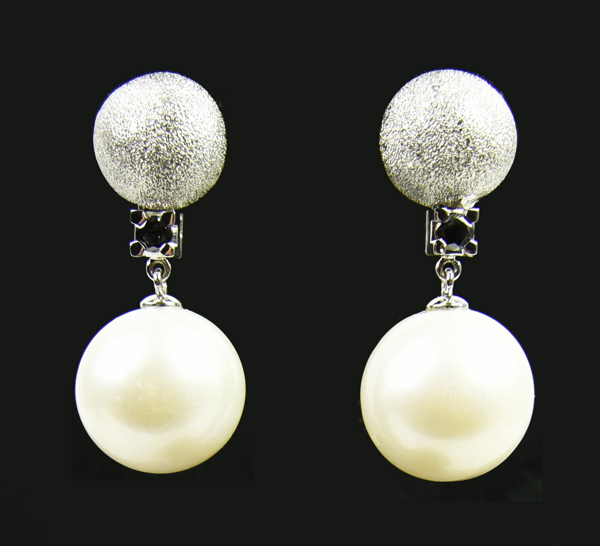 in oro bianco satinato 18kt, con perle australiane coltivate color bianco di 16 mm e diamanti neri taglio brillante per 0,34 ct circa.