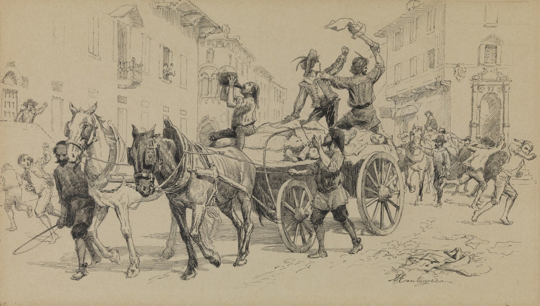 MANTEGAZZA GIACOMO (1853 - 1920) Scena dai Promessi Sposi. China su carta. Cm 30,00 x 20,00. Firmato in basso a destra. . Cornice presente