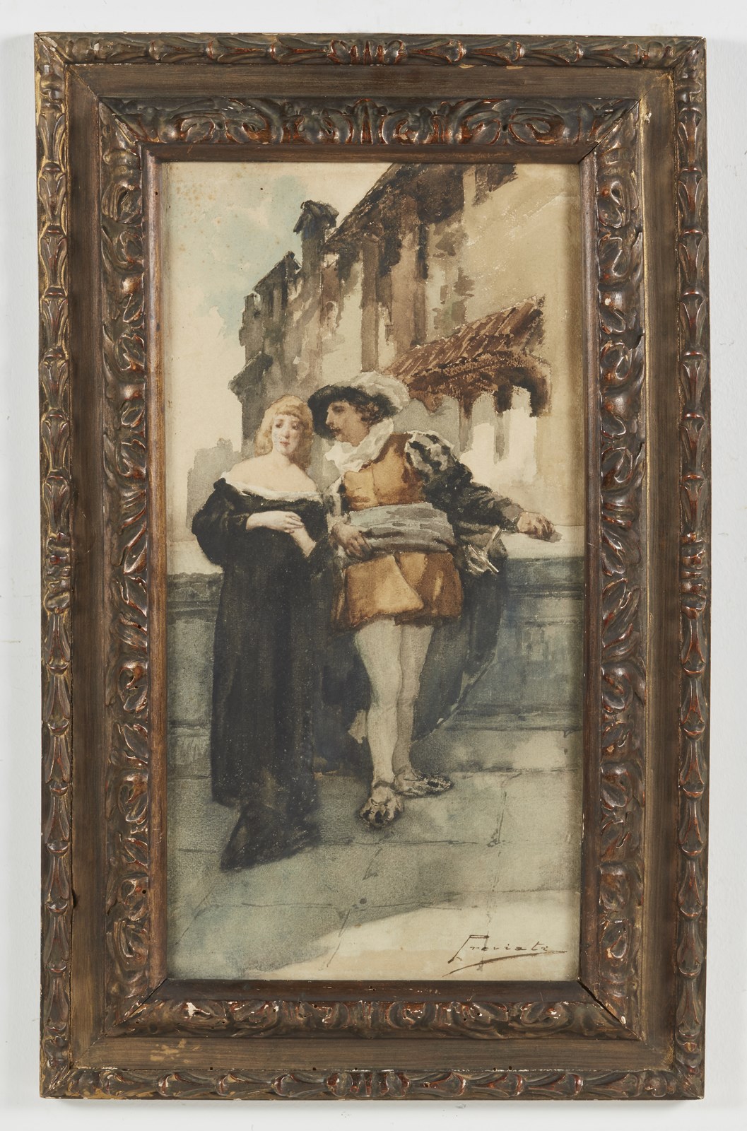 PREVIATI GAETANO (1852 - 1920) Scena galante. Acquerello su carta. Cm 26,00 x 50,50. Firmato in basso a destra.