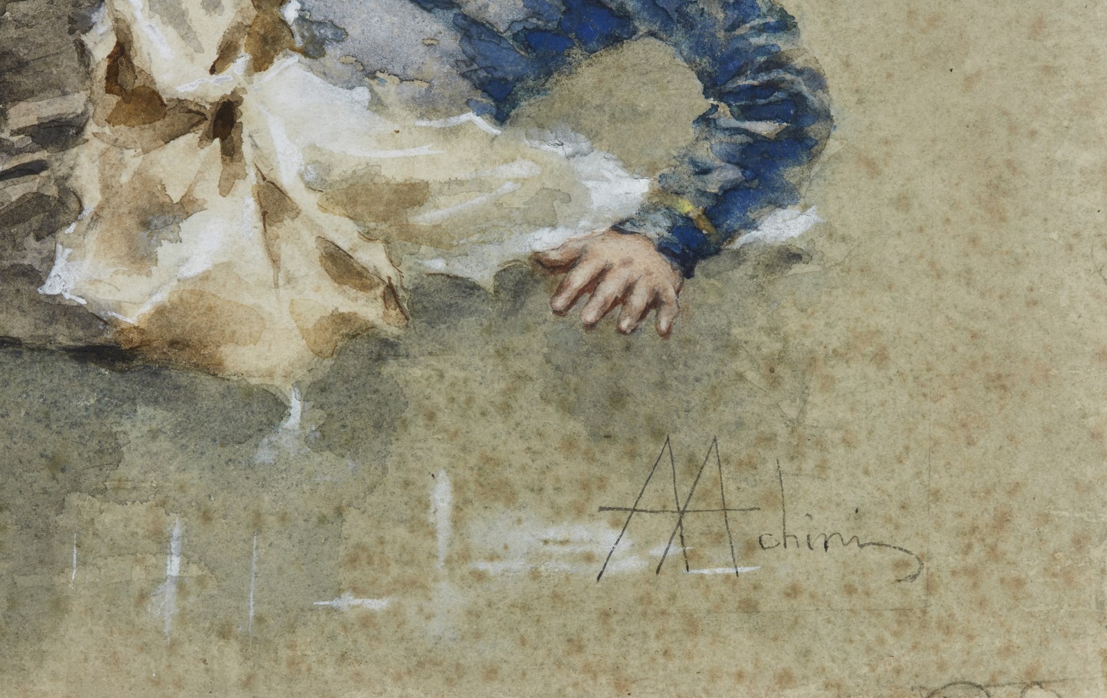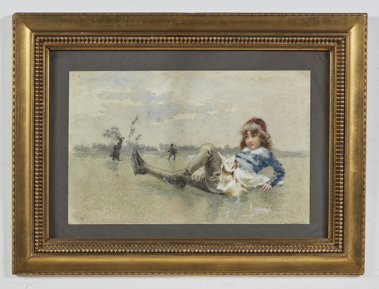 ACHINI ANGIOLO (1850 - 1930) Bambina con i pattini. . Acquerello su carta. Cm 52,00 x 35,00. Firmato in basso a destra.