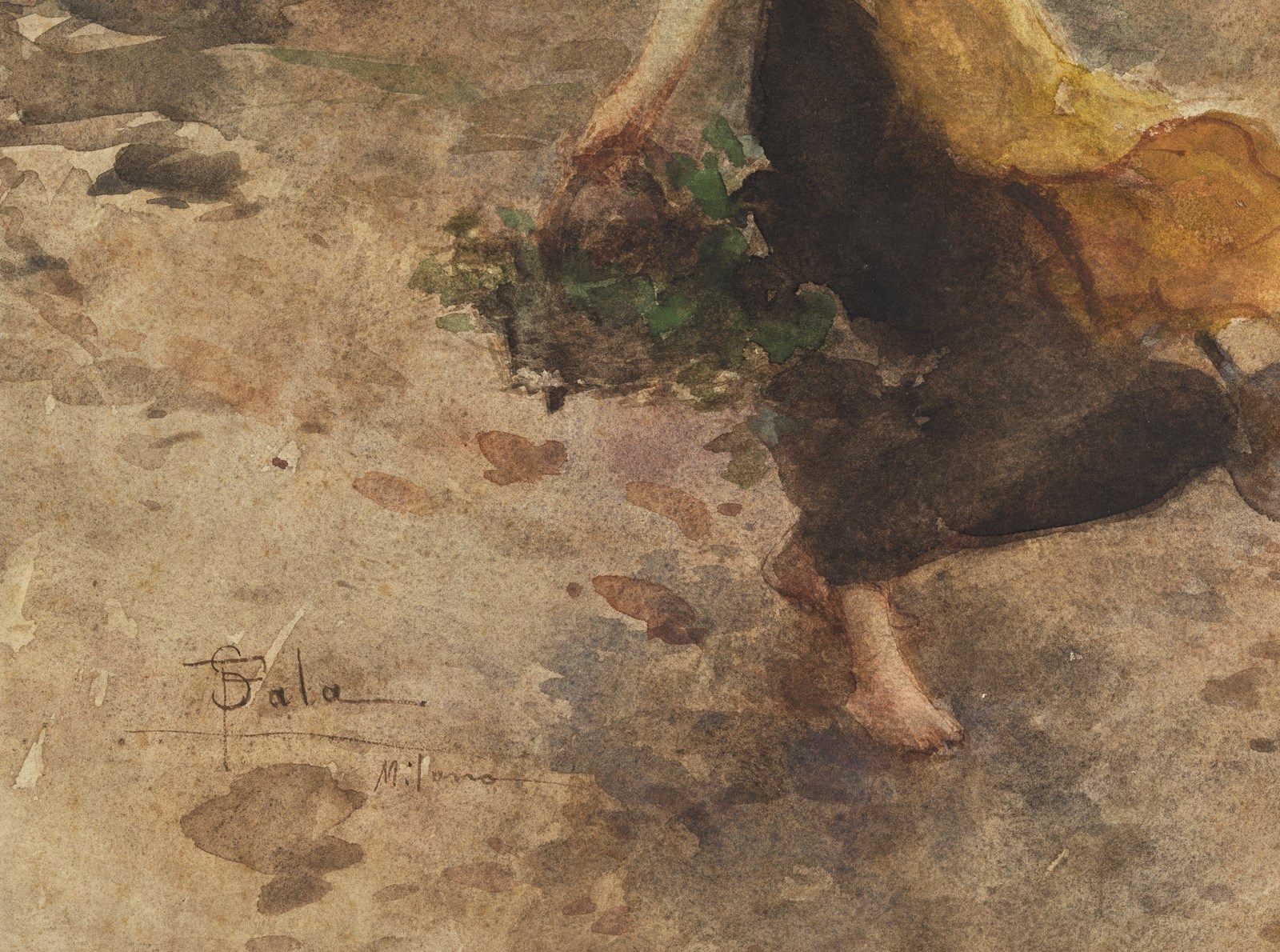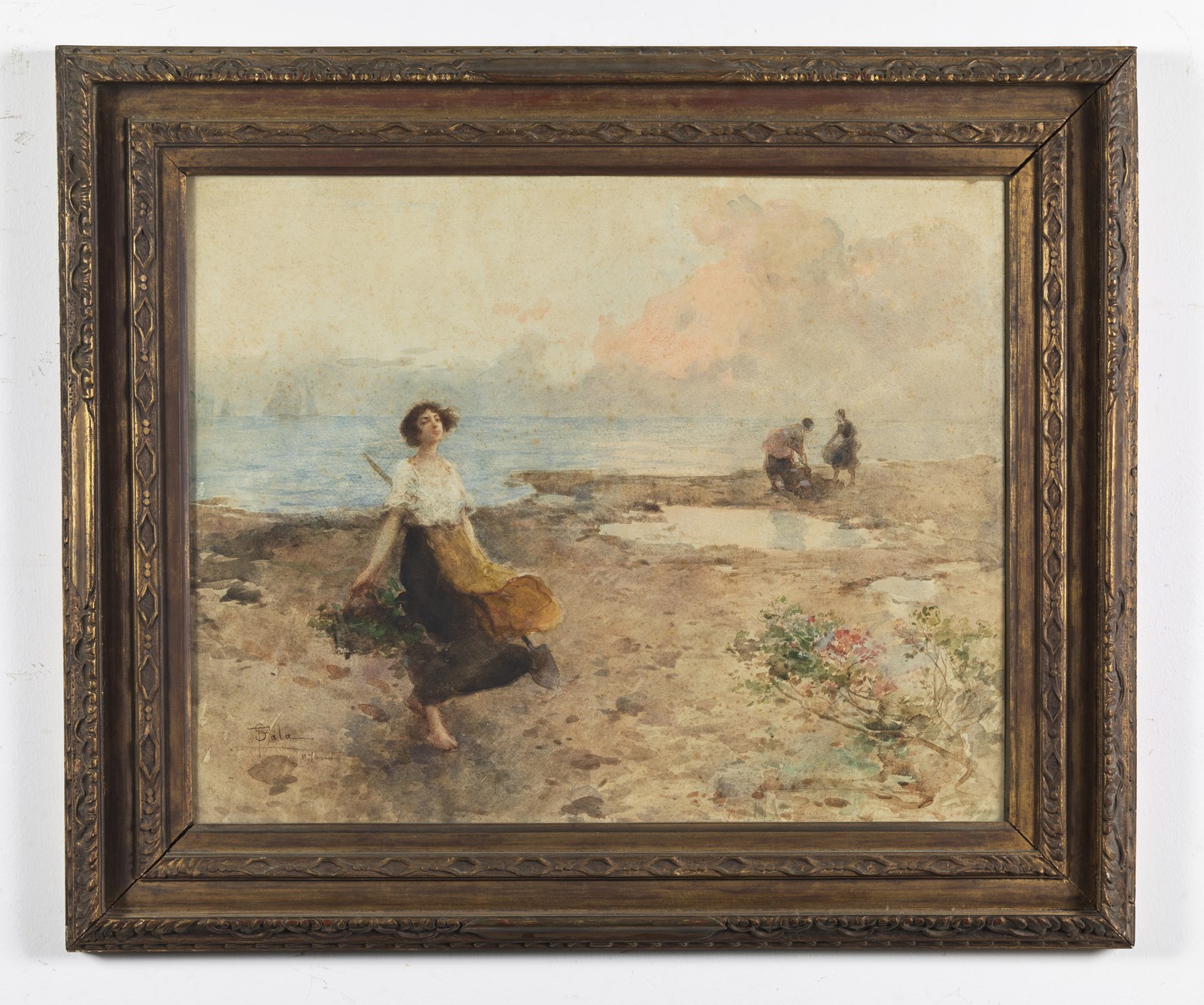 SALA PAOLO (1859 - 1924) Paesaggio marino con personaggi. Acquerello su carta. Cm 59,00 x 46,50. Firmato in basso a sinistra.