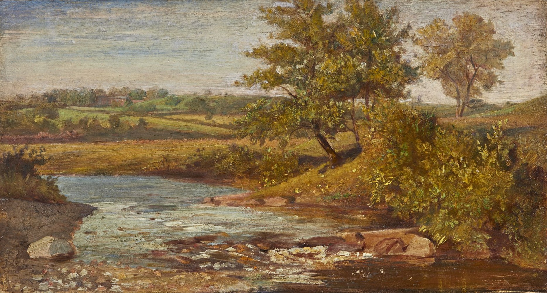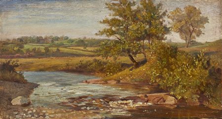 COSTA NINO (1826 - 1903) Paesaggio con fiume. . Olio su tavoletta. Cm 31,00 x 17,00. Provenienza: Carlisle Art Gallery, George Howard and his circle exhibition, November 1962.
