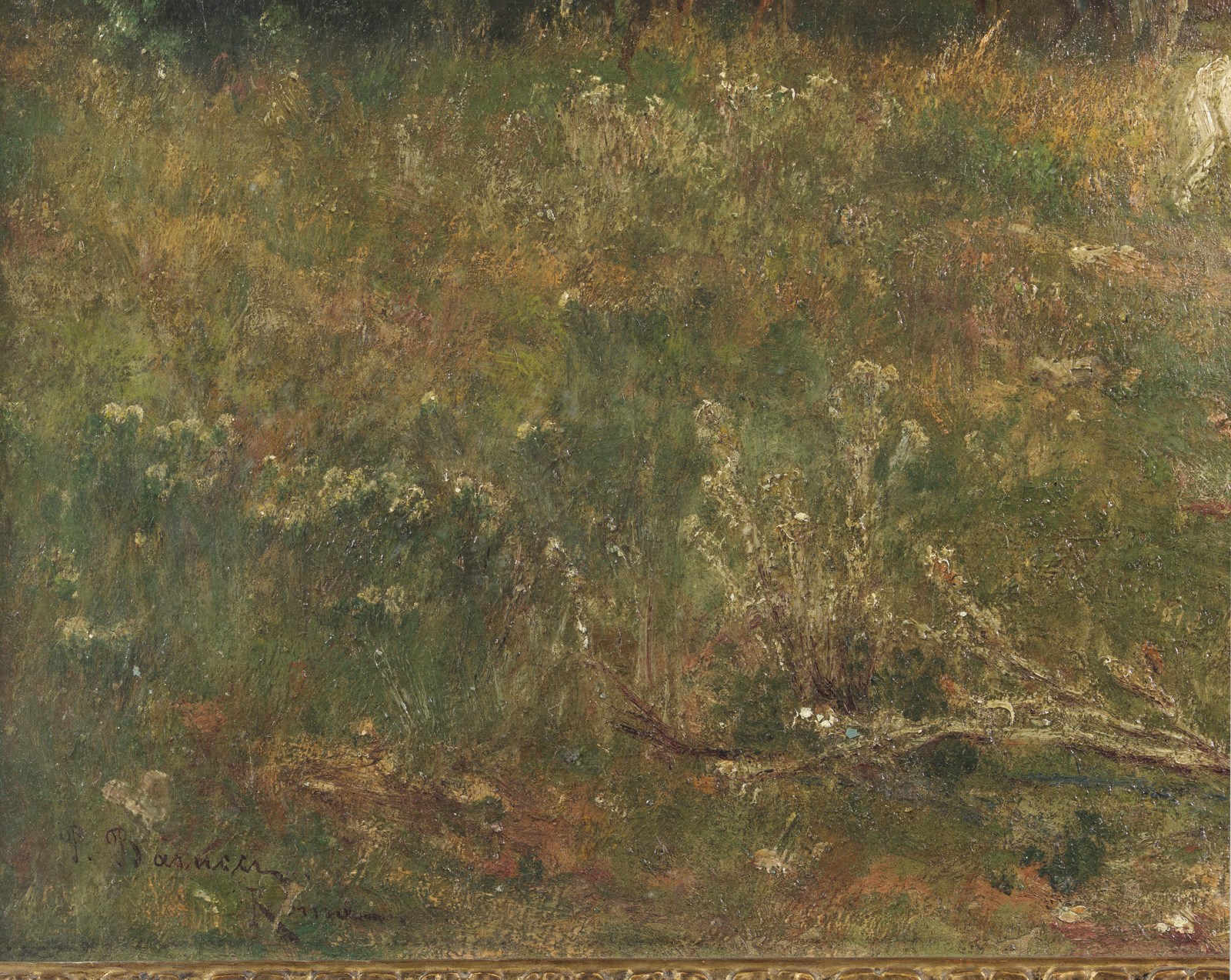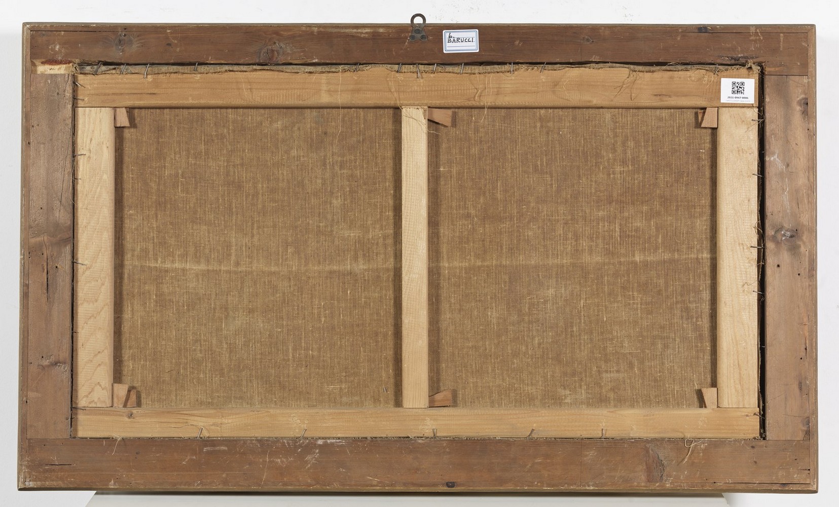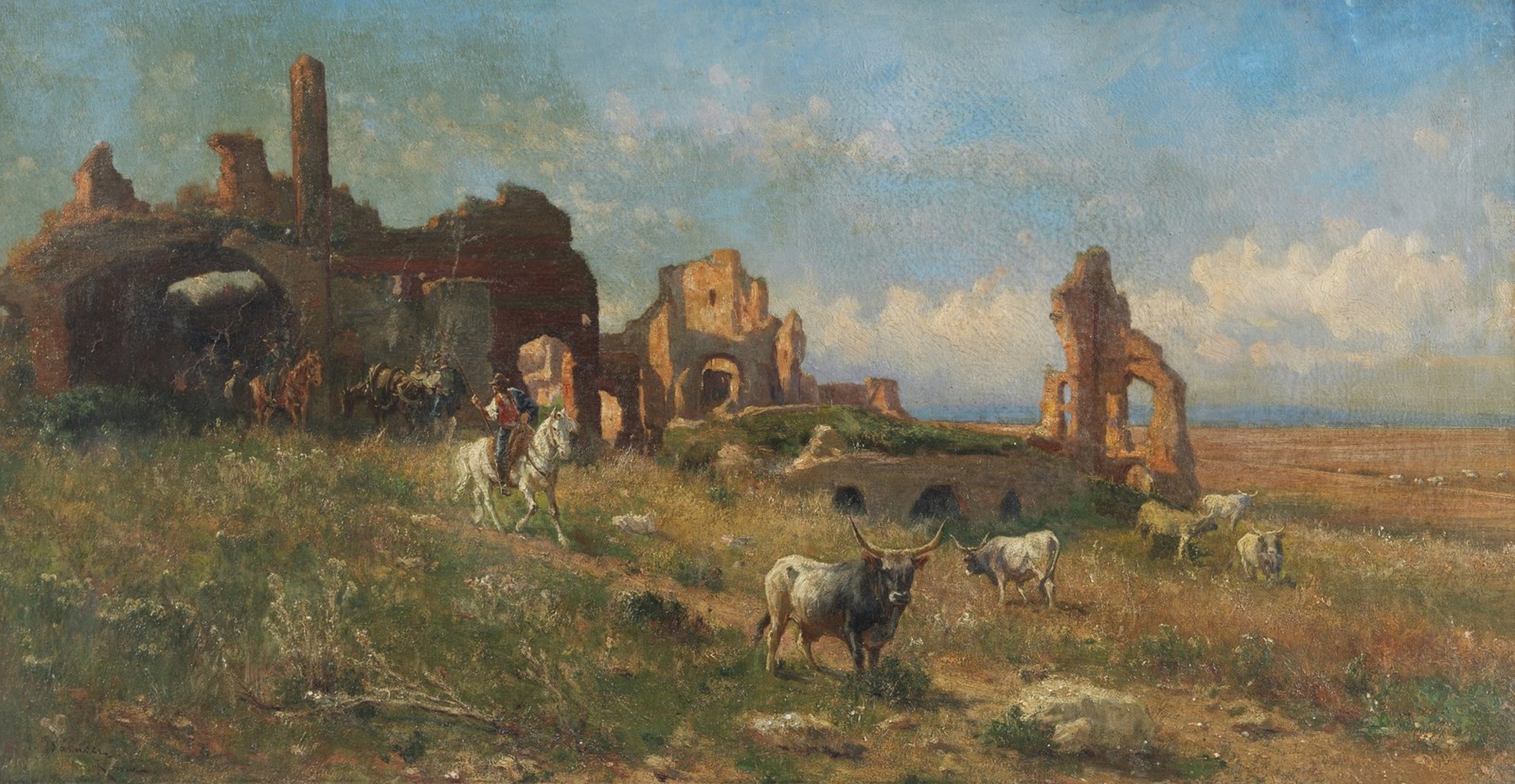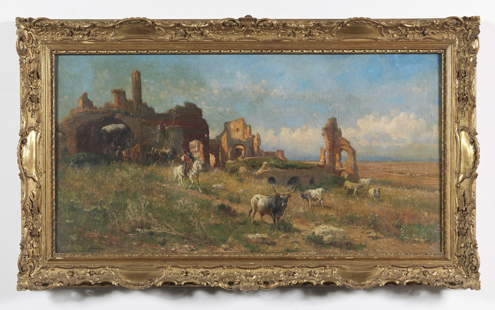 BARUCCI PIETRO (1845 - 1917) Paesaggio con rovine e armenti. . Olio su tela . Cm 109,00 x 58,50. Firmato in basso a sinistra. Pubblicazione: rivista A.D. del mese di gennaio 1988 alla p. 104. Cornice presente