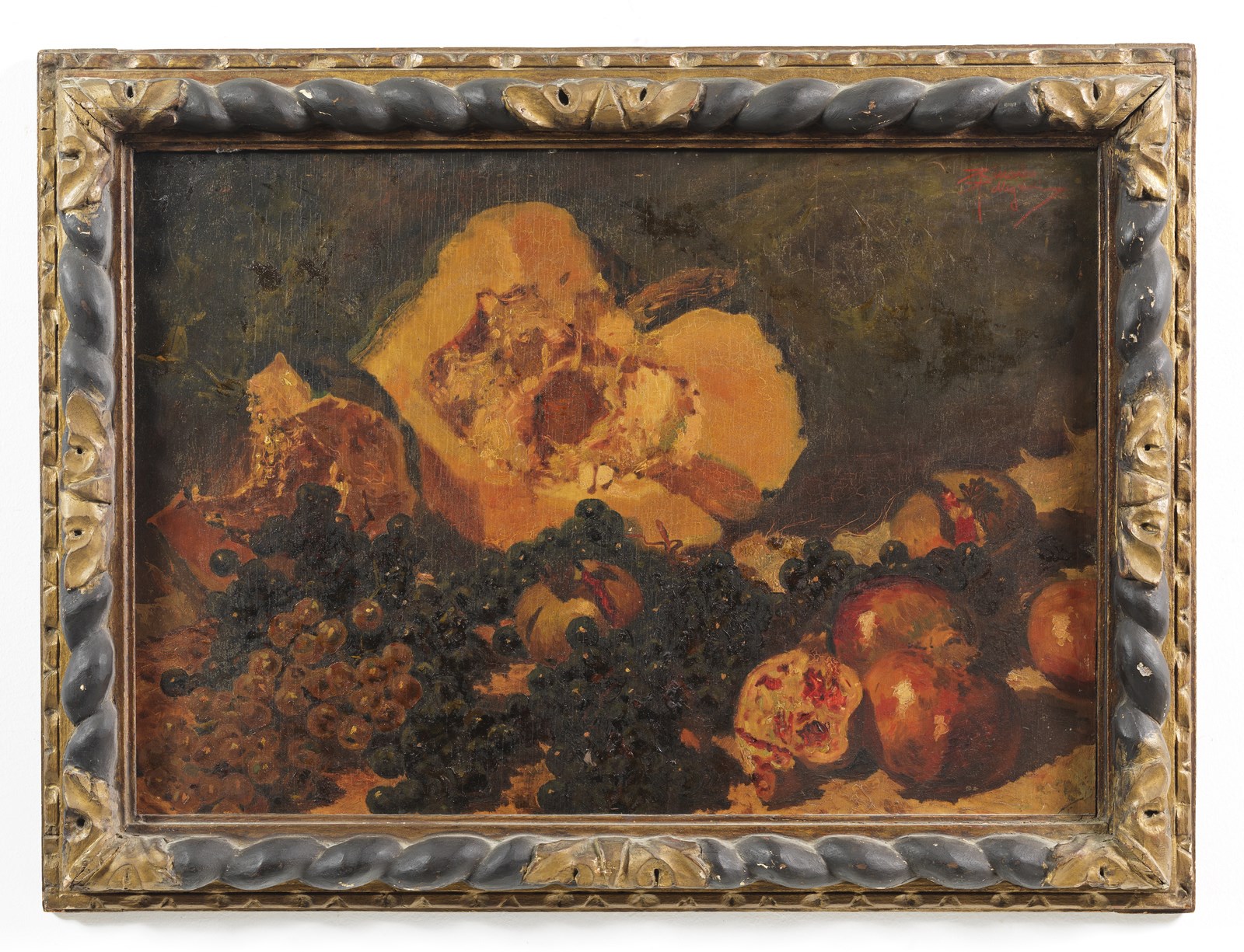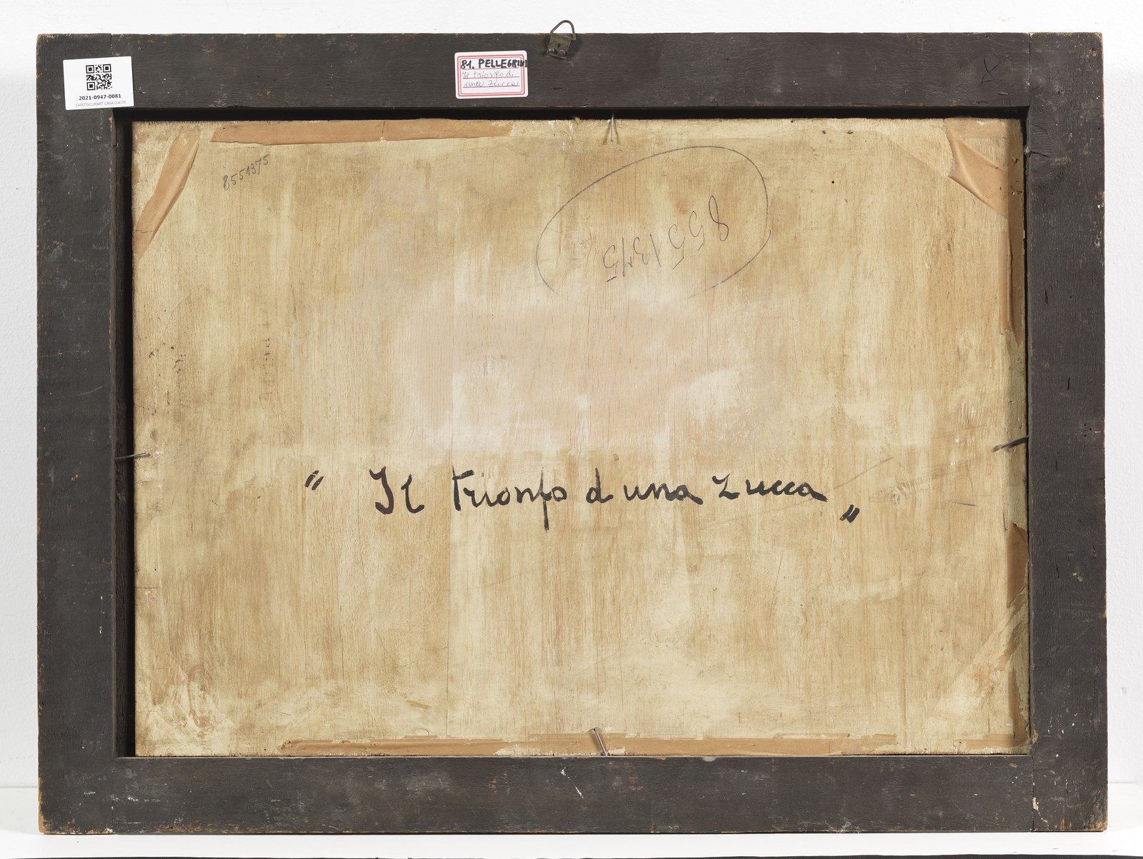 PELLEGRINI RICCARDO (1863 - 1934) Il trionfo di una zucca. Olio su tavola. Cm 70,00 x 50,00. Firmato in alto a destra. Intitolato al retro.