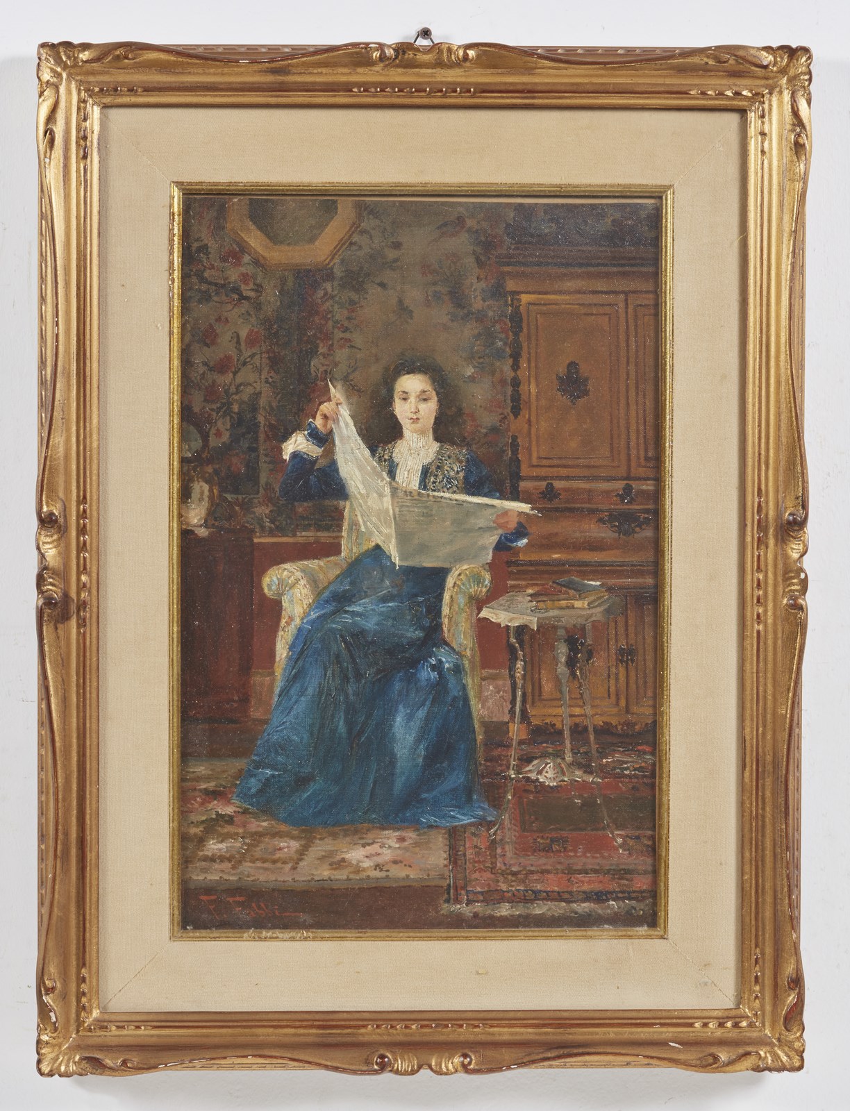 FABBI FABIO (1861 - 1946) La lettura. Olio su tela . Cm 30,00 x 45,50. Firmato in basso a sinistra.
