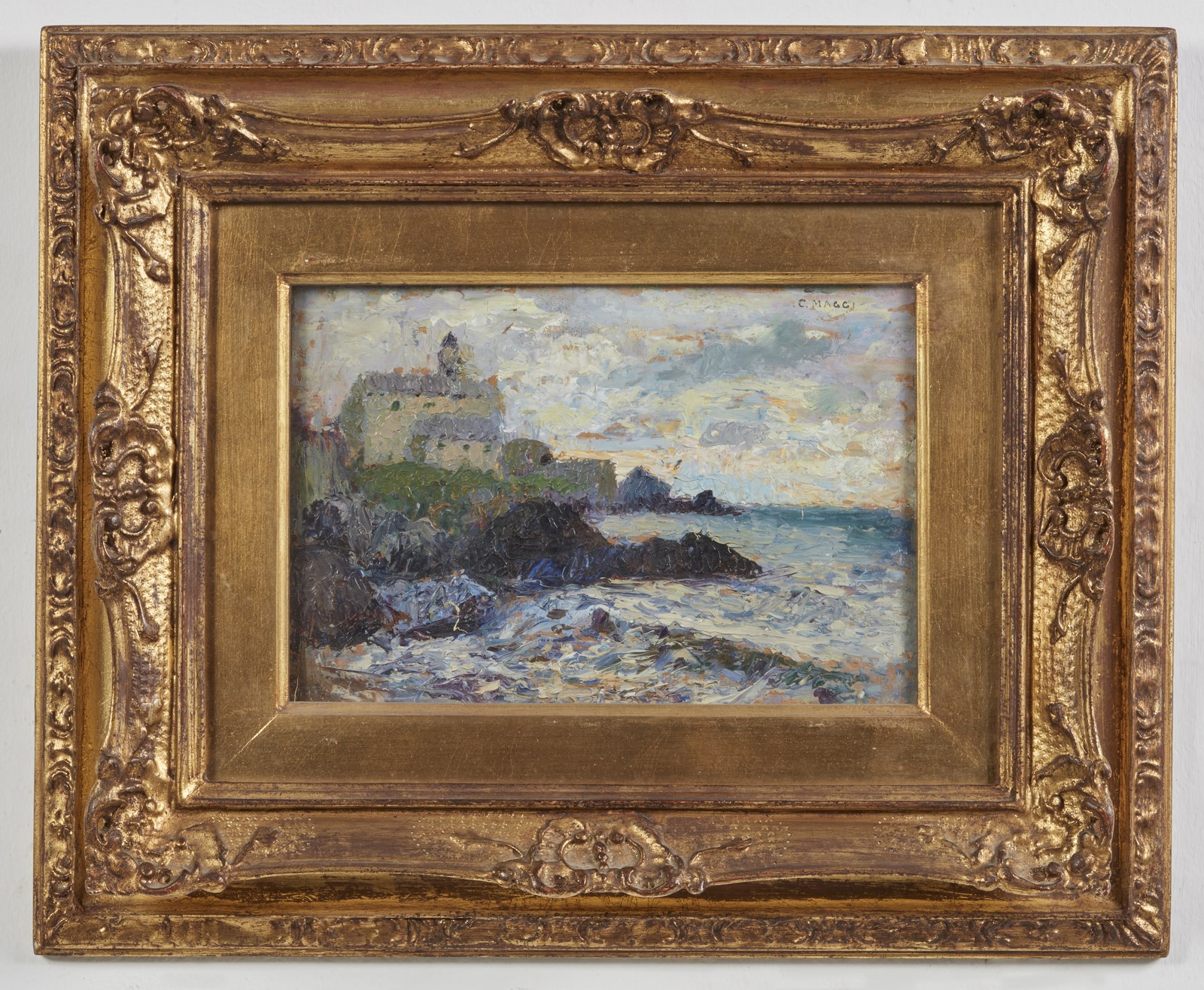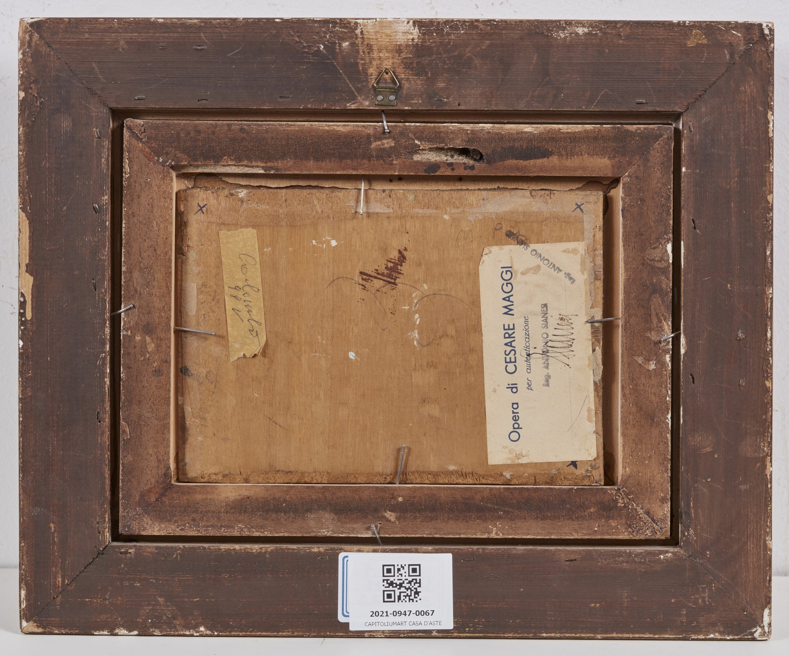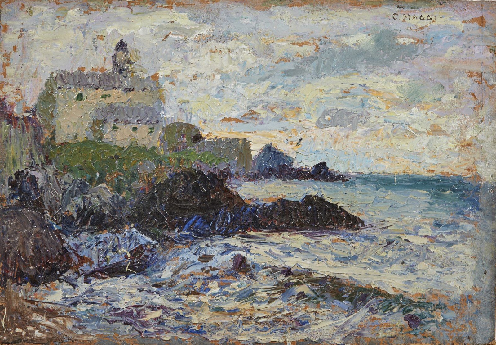 MAGGI CESARE (1881 - 1961) Marina. Olio su tavoletta. Cm 22,00 x 15,00. Firmato in alto a destra. Al retro certificato di autenticità a cura di Antonio Sianesi.