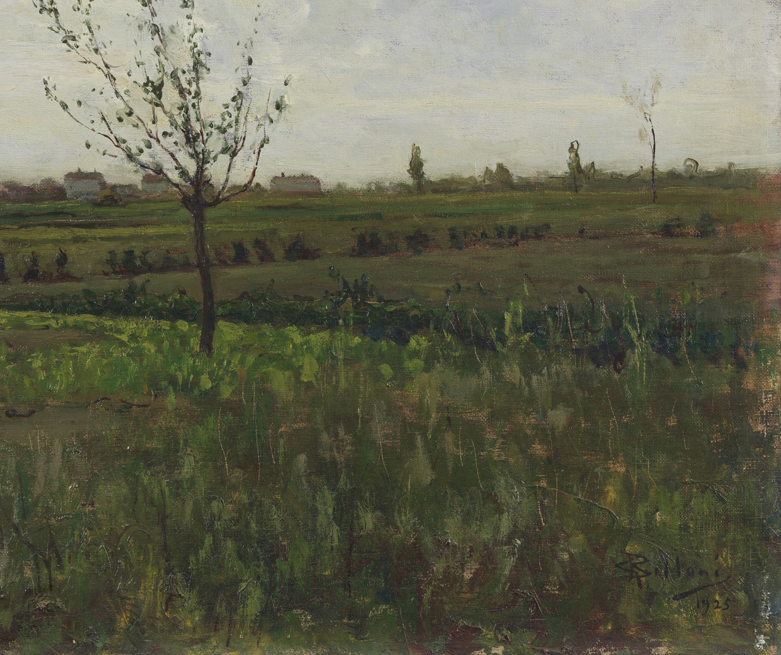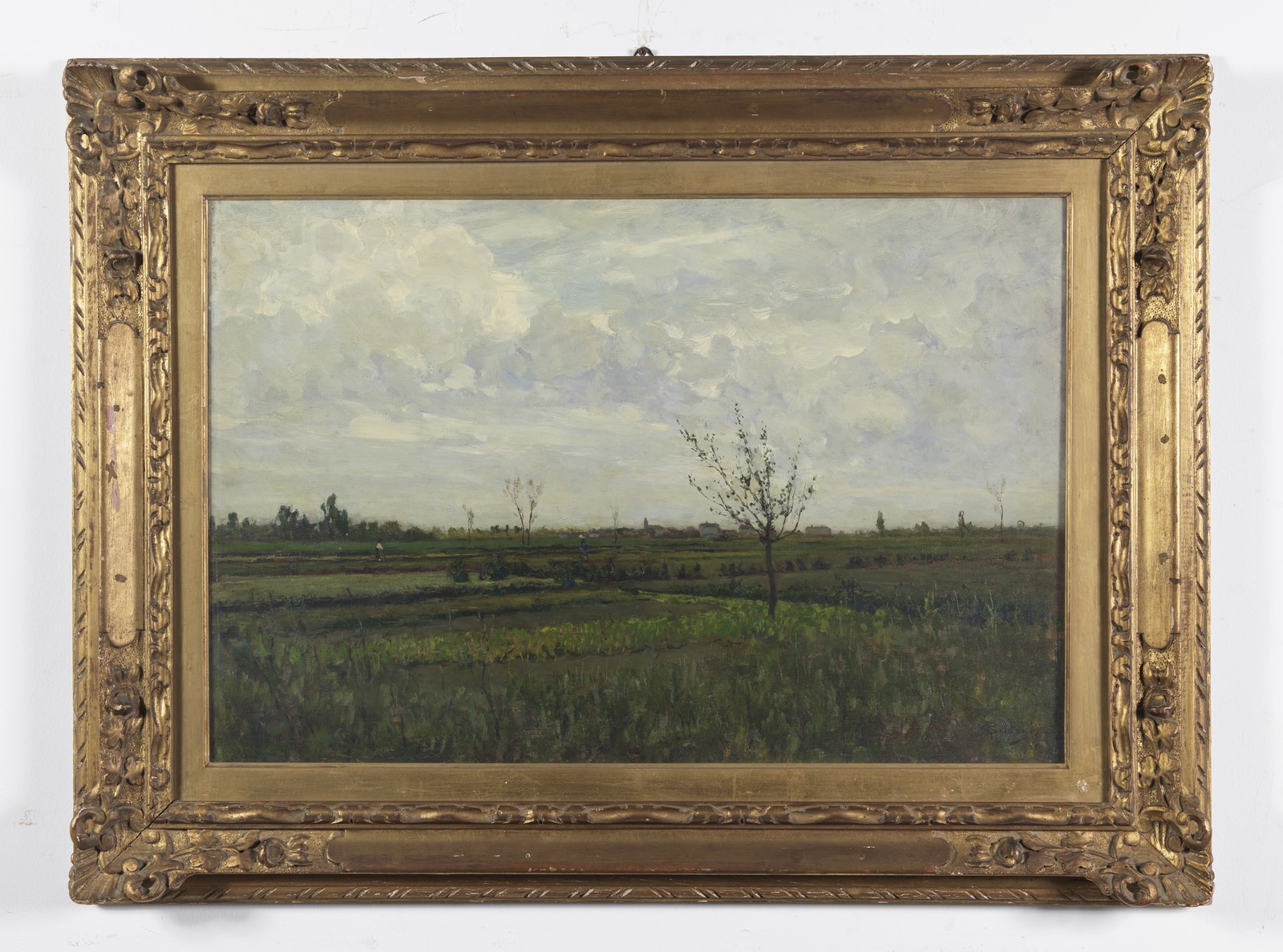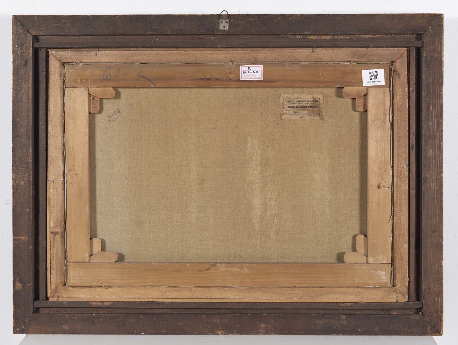 BELLONI GIORGIO (1861 - 1944) Paesaggio campestre. Olio su tela . Cm 80,00 x 55,00. Firmato e datato 1925 in basso a destra. Al retro cartiglio “Celebrazione del Centenario Stradivario di Cremona, 1937, 1^ Fiera Nazionale dell’800".