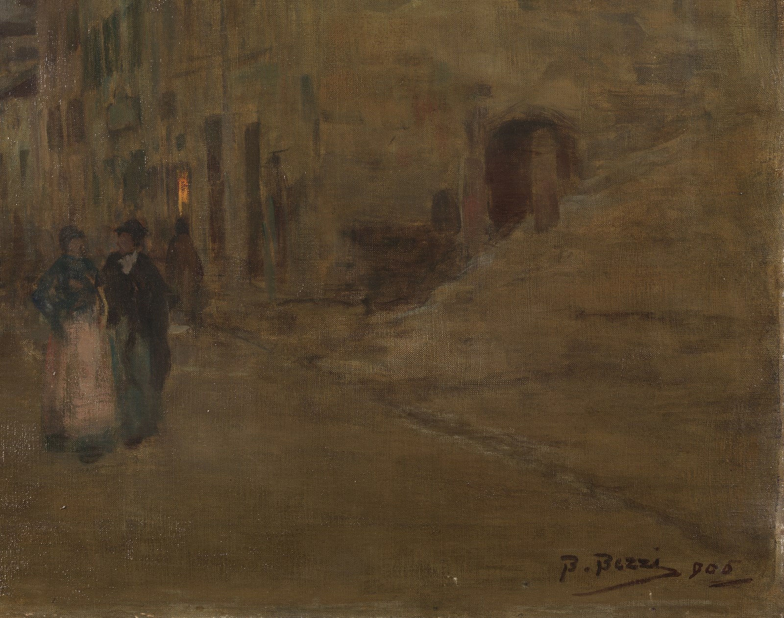 BEZZI BARTOLOMEO (1851 - 1923) Paesaggio al crepuscolo. . Olio su tela . Cm 54,50 x 80,00. Firmato e datato 1906 in basso a destra. Al retro timbro Associazione Artisti Italiani, II esposizione 1906-1907, Firenze.