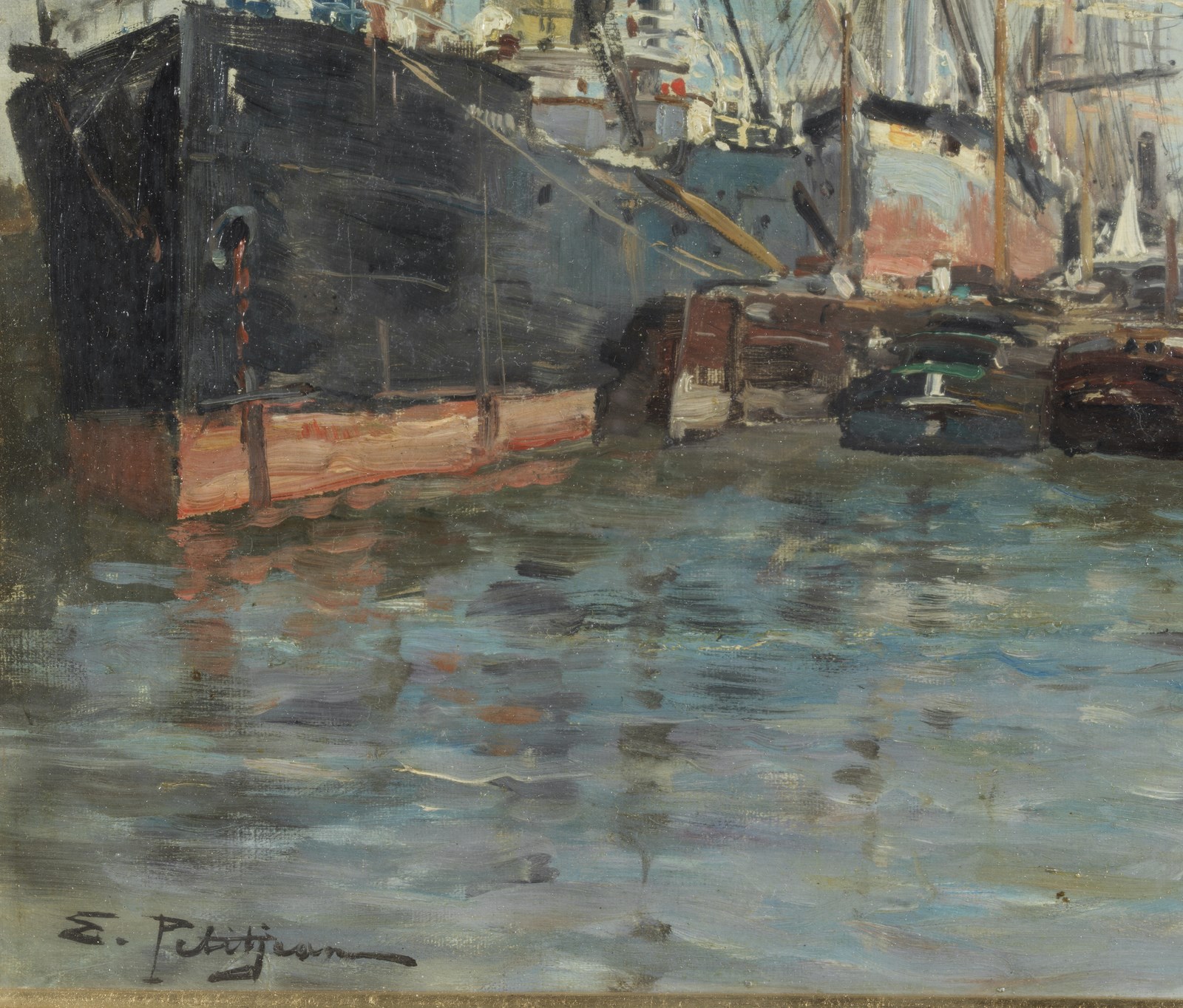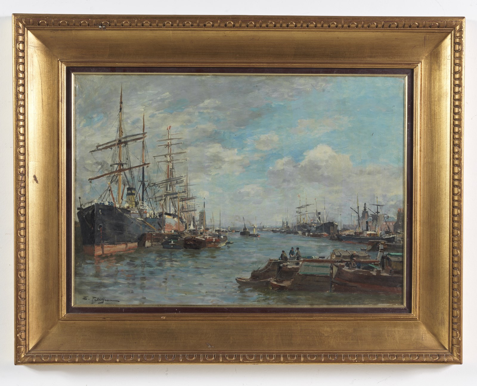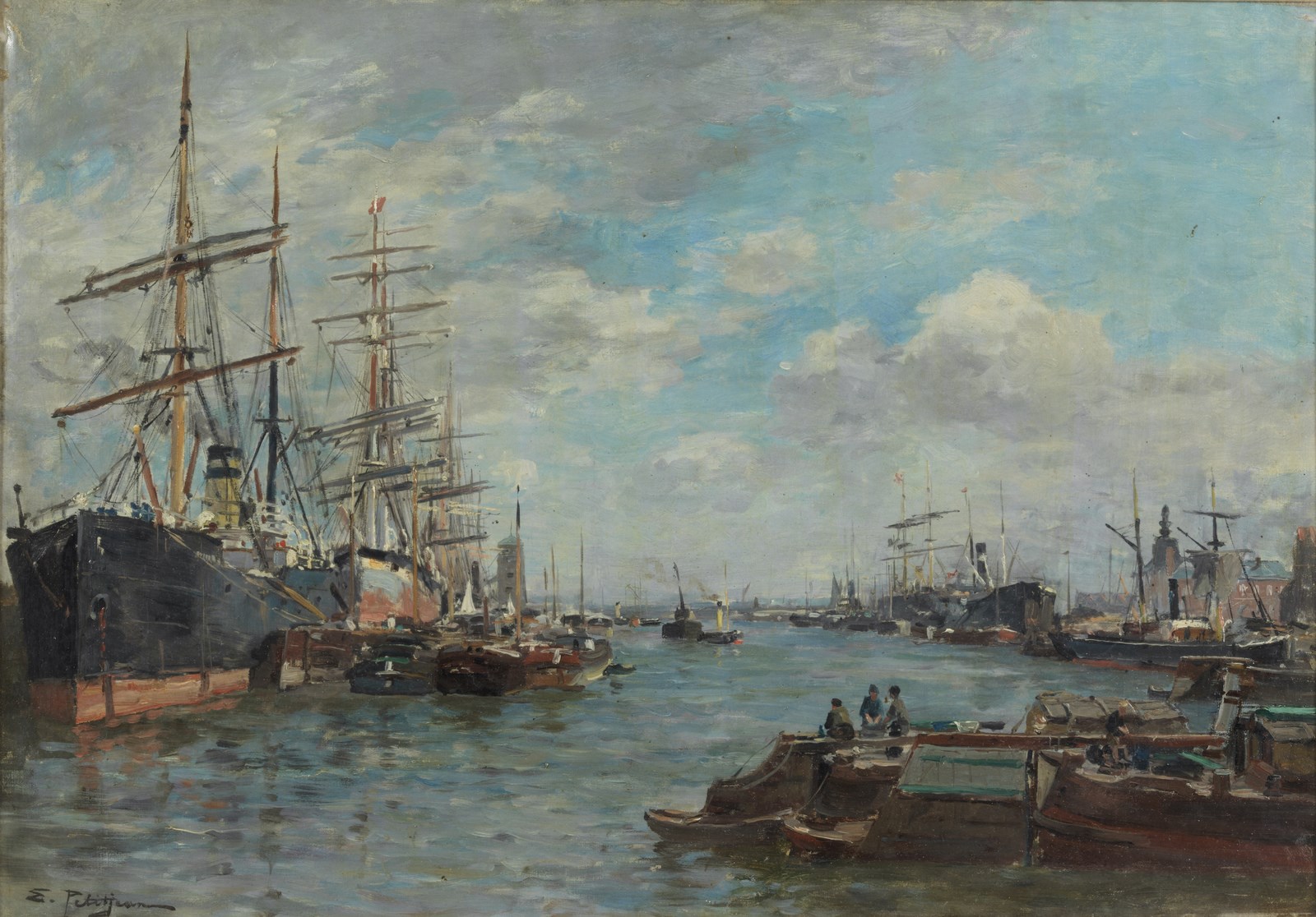 PETITJEAN EDMOND MARIE (1844 - 1925) Il porto di Anversa. Olio su tela . Cm 68,00 x 50,00. Firmato in basso a sinistra. Cornice presente