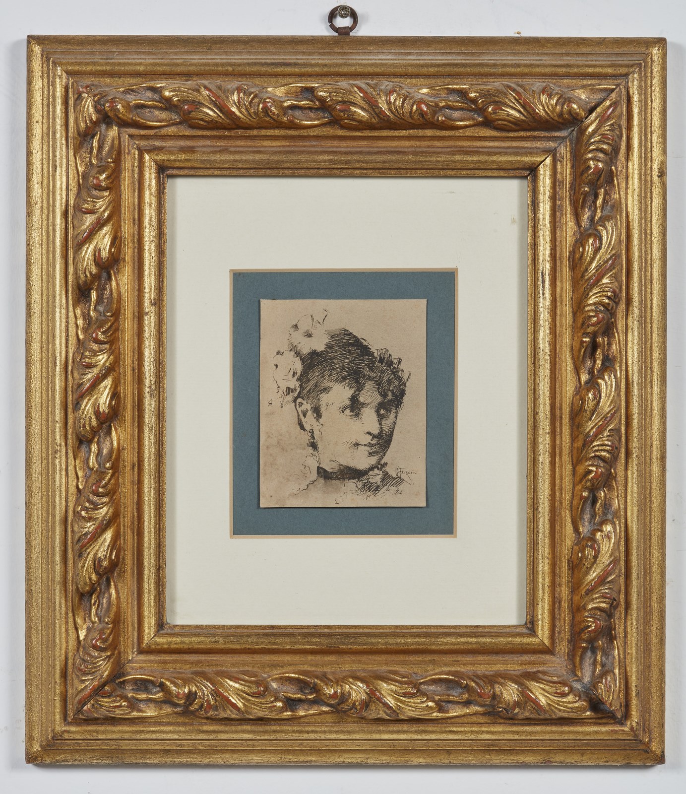 FAVRETTO GIACOMO (1849 - 1887) Studio di testa. China su carta. Cm 9,00 x 11,00. Firmato in basso a destra. Opera archiviata presso l'Archivio Generale del pittore Giacomo Favretto, come da documentazione fotografica allegata all'opera riportante il relativo numero di inventario. . Cornice presente