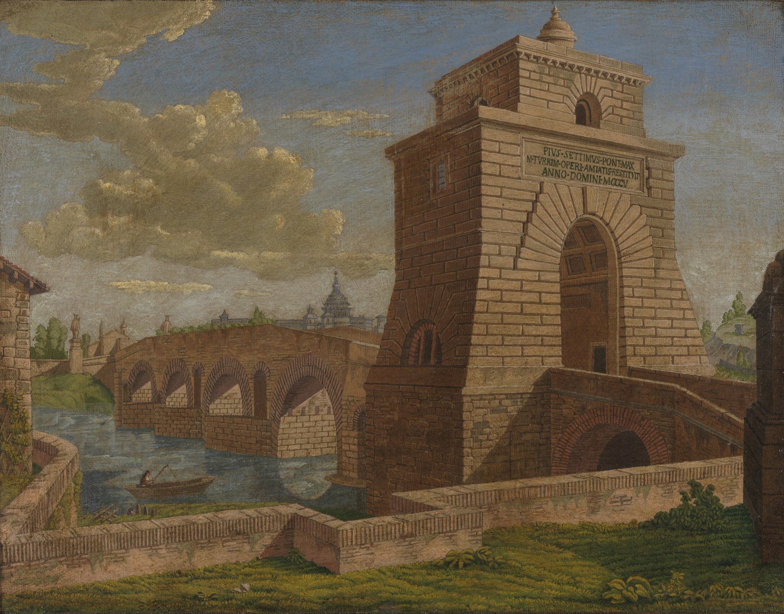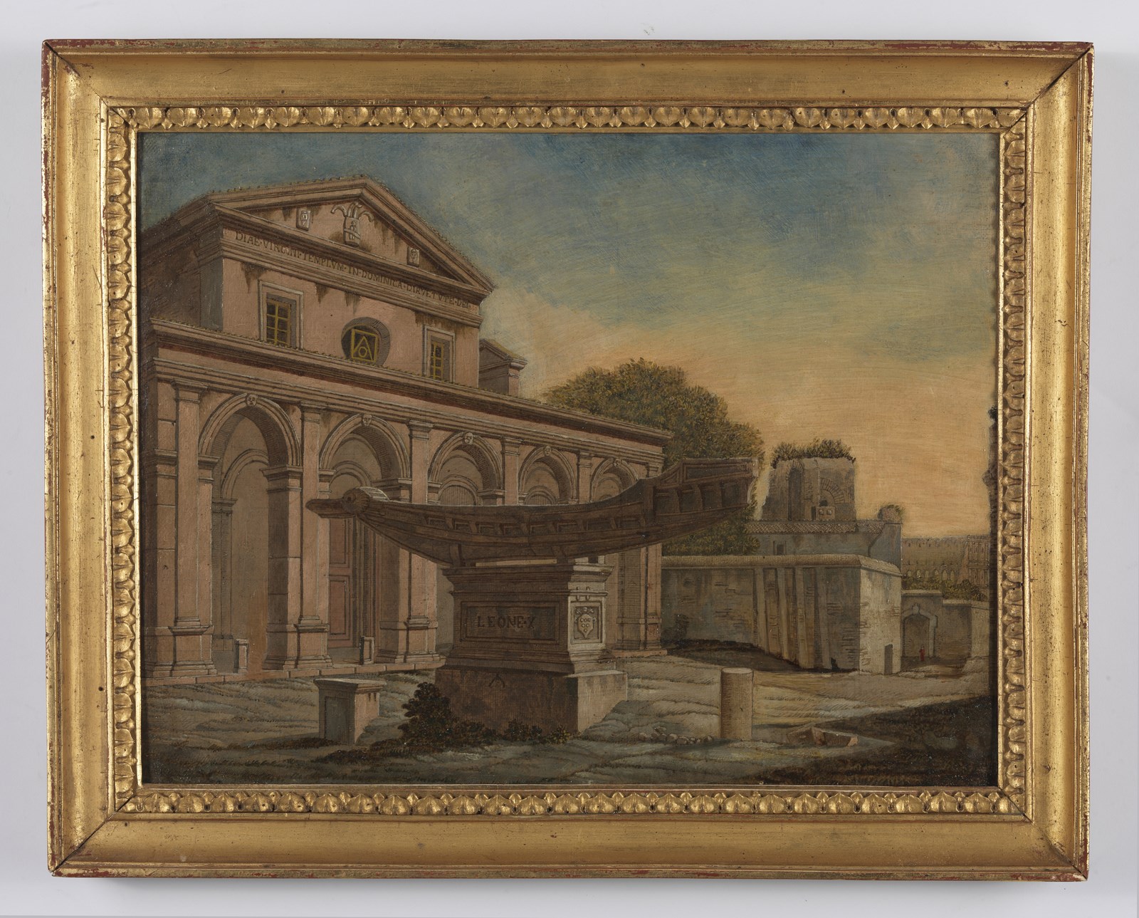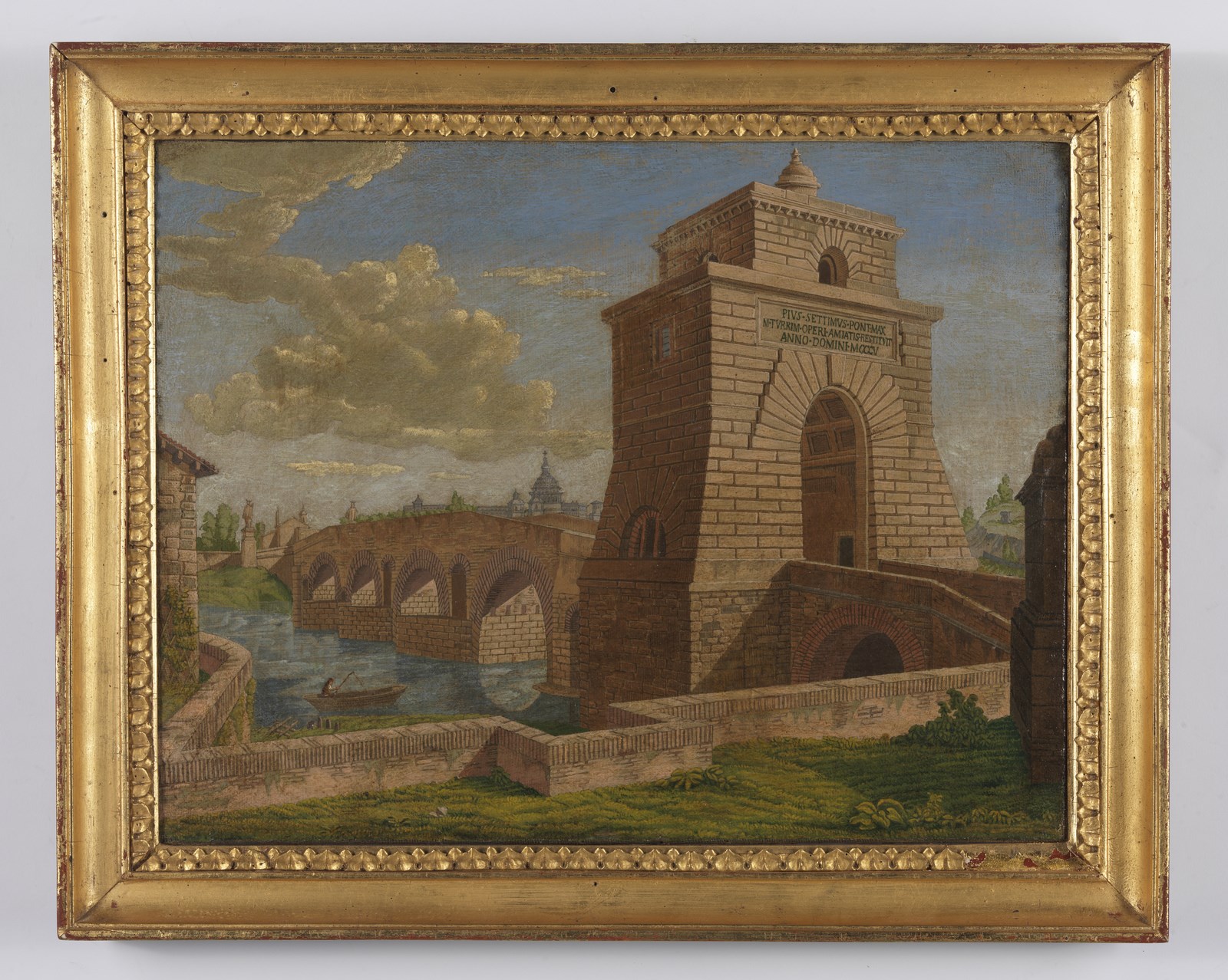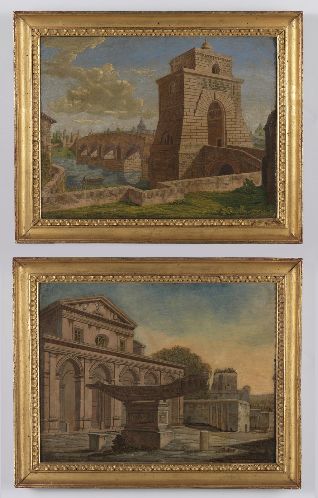 ARTISTA DEL XIX SECOLO - Coppia di dipinti raffiguranti la Basilica di Santa Maria in Domnica con la fontana della Navicella e Ponte Milvio con l'ingresso del Valadier.