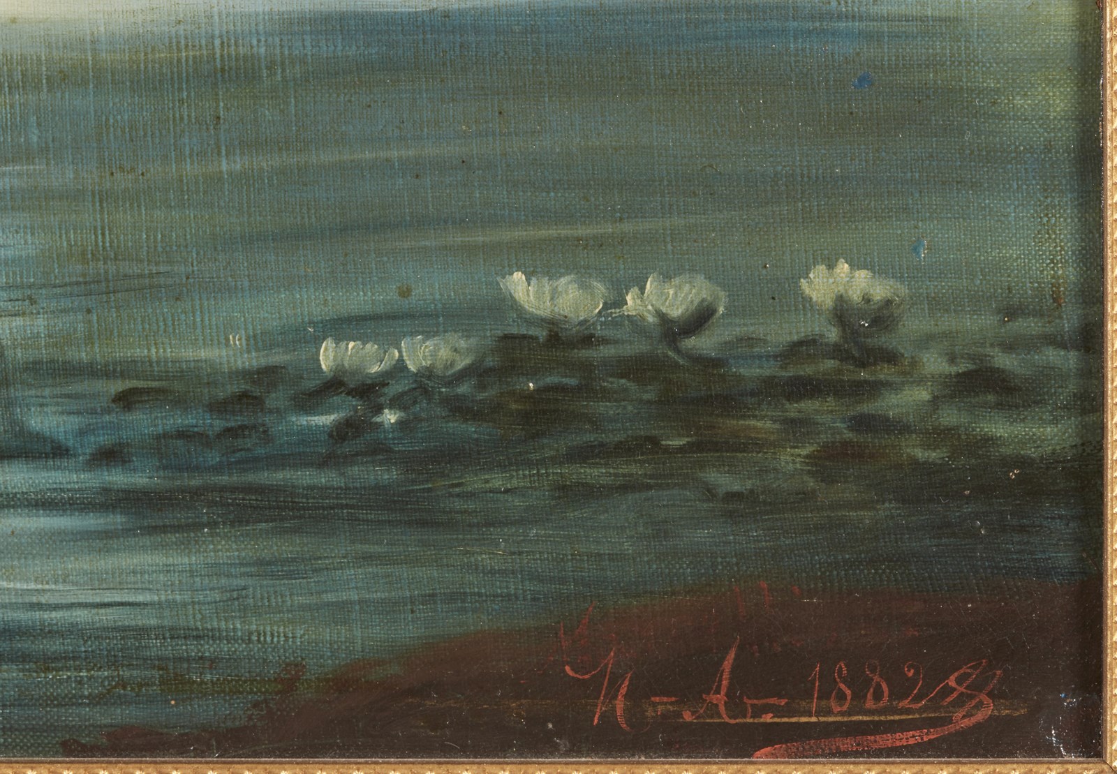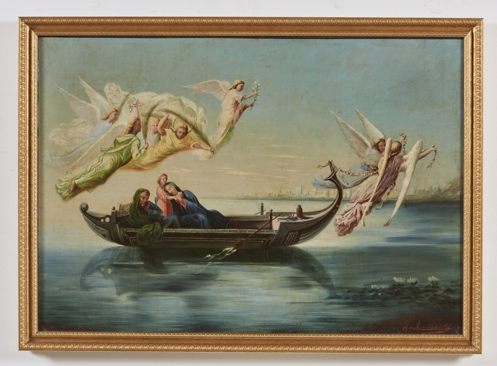 ARTISTA DELLA FINE DEL XIX SECOLO Ritorno dalla fuga in Egitto. . Olio su tela . Cm 81,00 x 56,70. Firma monogrammata e datato 1882 in basso a destra. Cornice presente