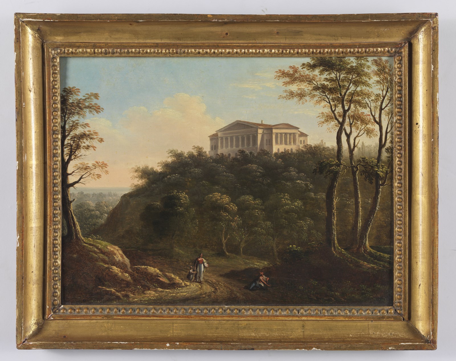 BARBIERI GIOVANNI (1780 - 1864) Coppia di dipinti raffiguranti veduta di Villa Aldini e veduta dell'Abbazia di Monteveglio. . Olio su tavola. Cm 33,50 x 25,50. Al retro timbro in ceralacca.