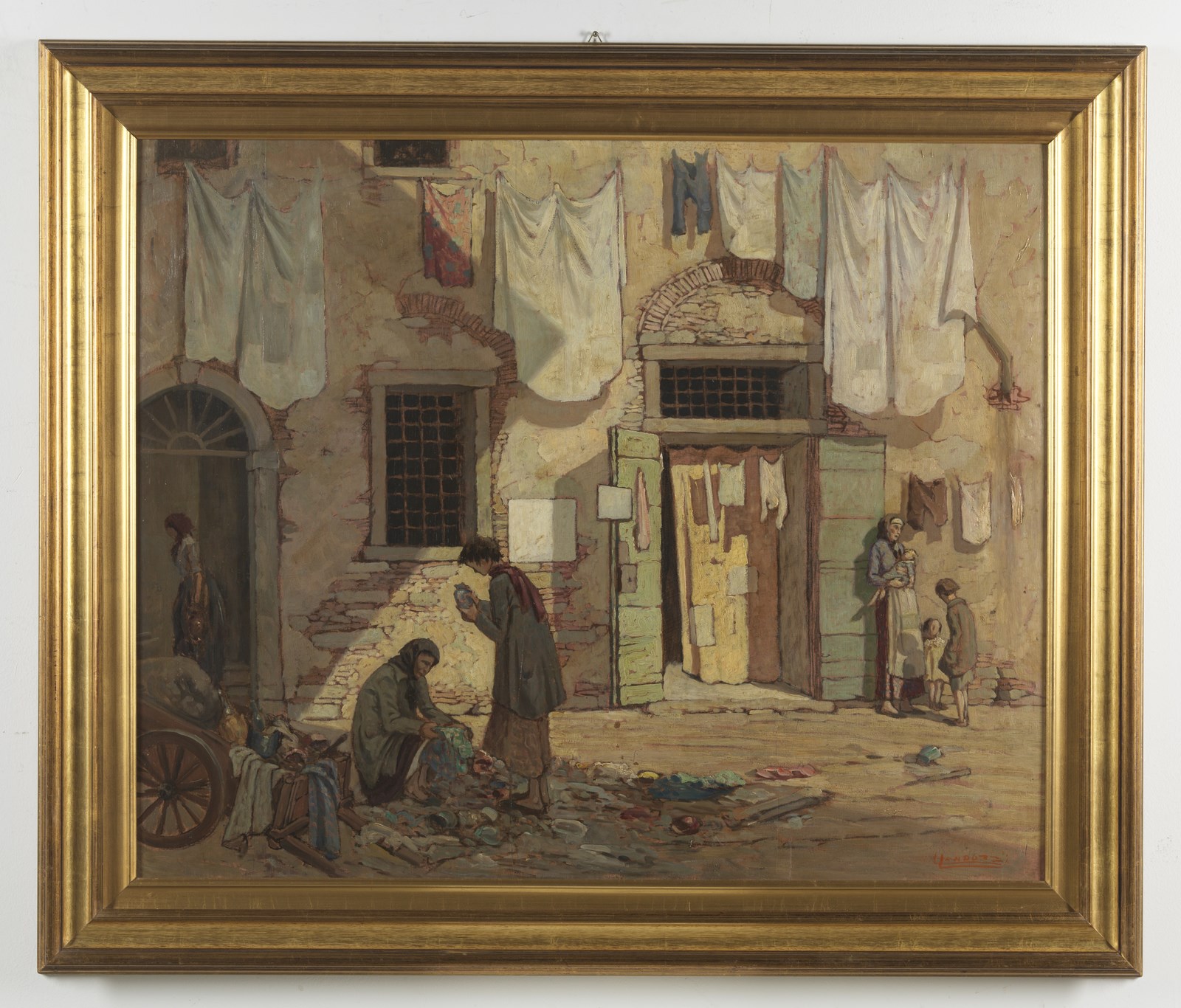 LANDOZZI LANDO (1887 - 1959) Le cenciaie. . Olio su cartone pressato. Cm 105,50 x 86,00. Firmato in basso a destra. Cornice presente