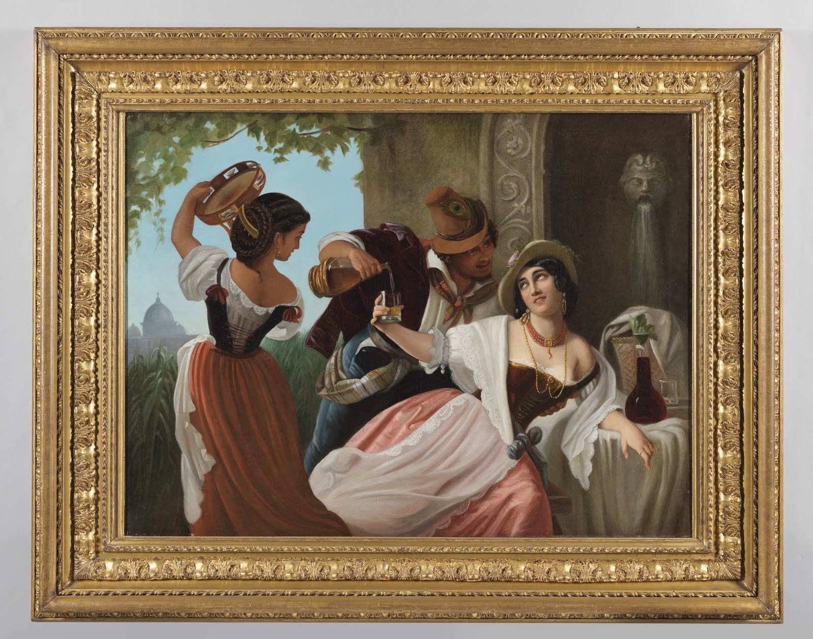 ORLOV PIMEN NIKITICH (1812 - 1863) Seguace di. Celebrazione di Ottobre a Roma. Olio su tela . Cm 100,00 x 76,00. Per confronto si veda l'opera di Orlov raffigurante lo stesso soggetto, commissionata nel 1847 e completata nel 1851, conservata nella Galleria Statale Tretyakov di Mosca. . Cornice presente