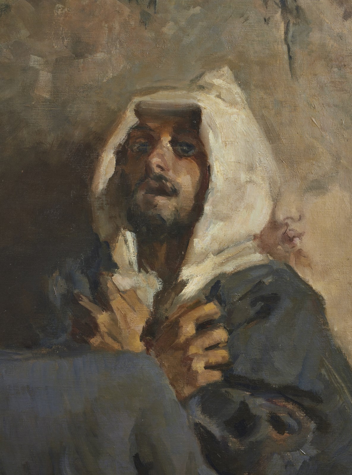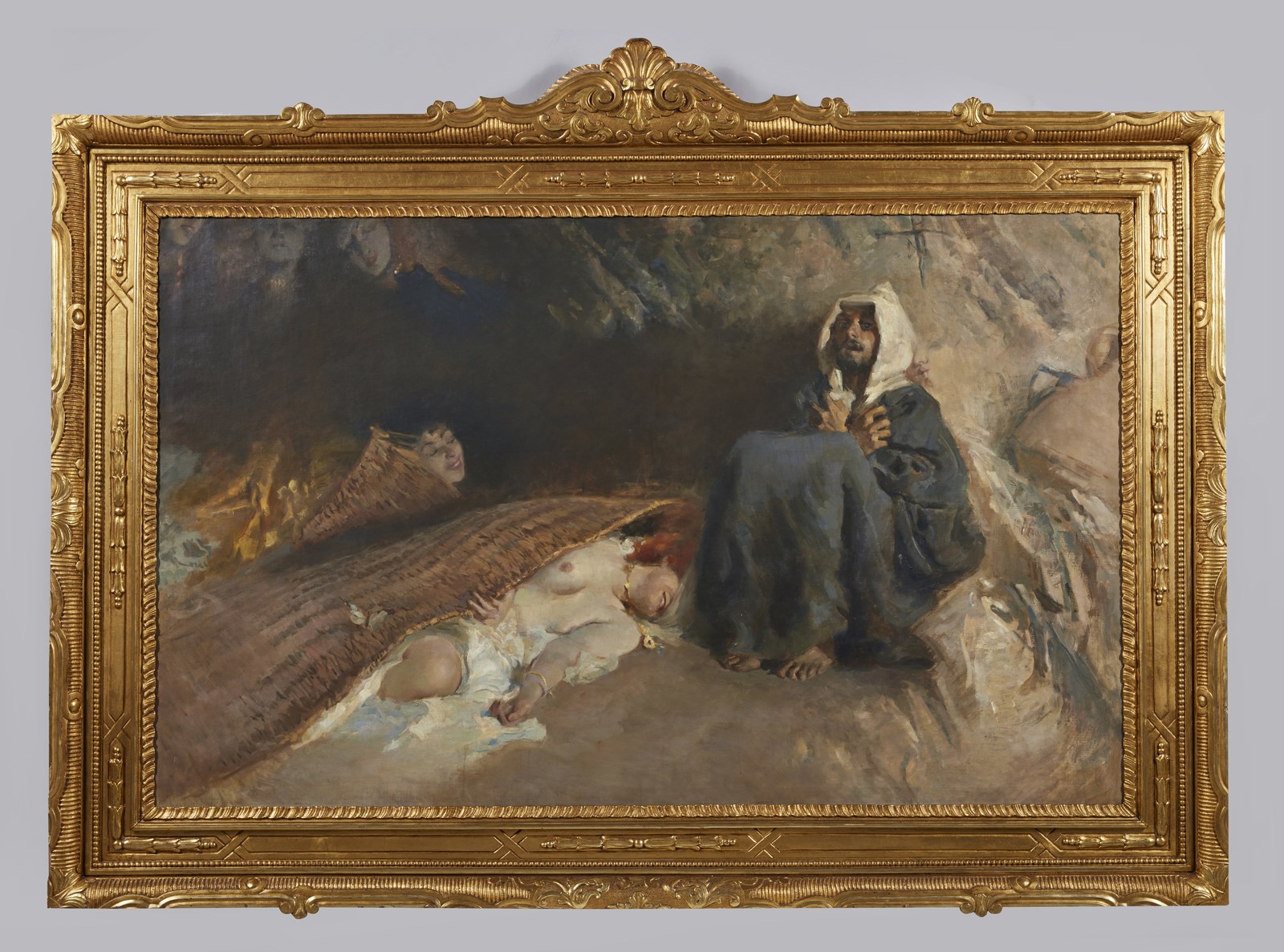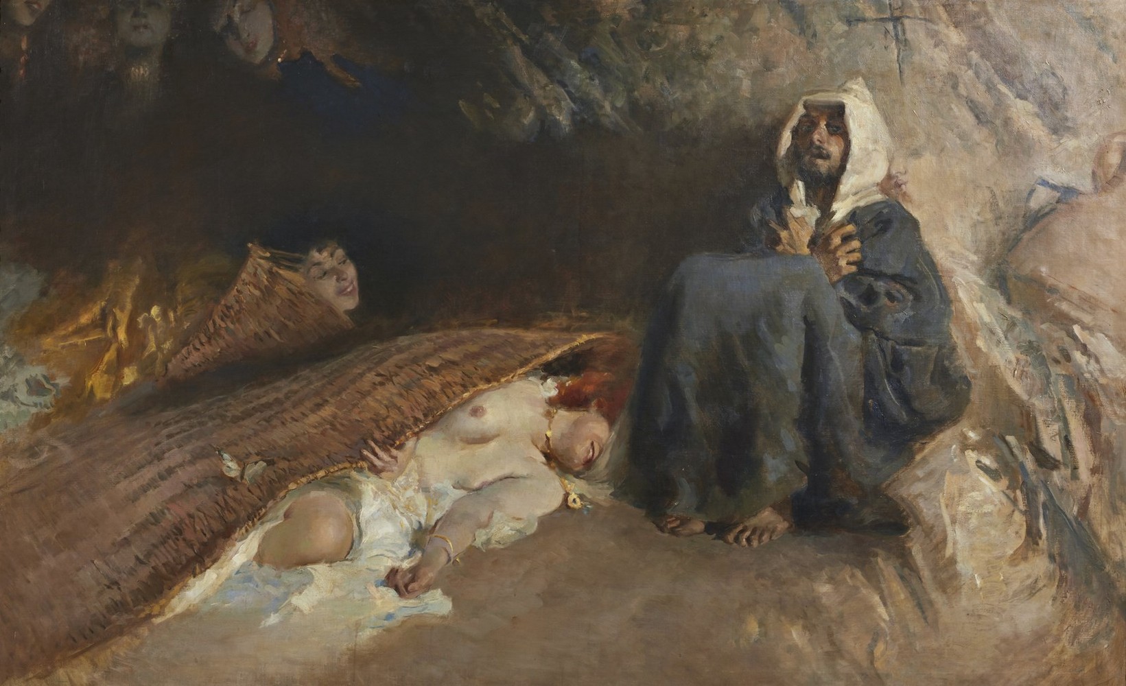 CARELLI AUGUSTO (1871 - 1940) Le tentazioni di Sant'Antonio. . Olio su tela . Cm 205,50 x 127,00. Al retro sul telaio riporta la dicitura "Augusto Morelli da un quadro di Morelli, le tentazioni di S. Antonio". . Cornice presente