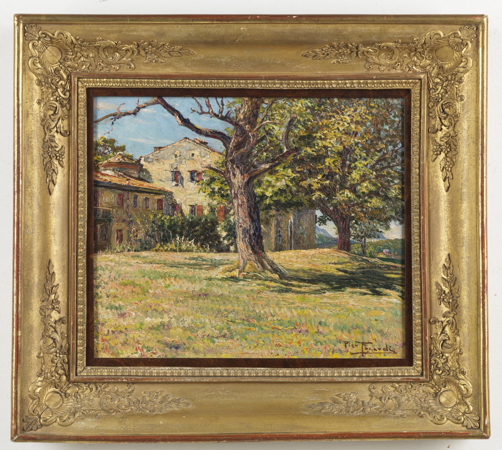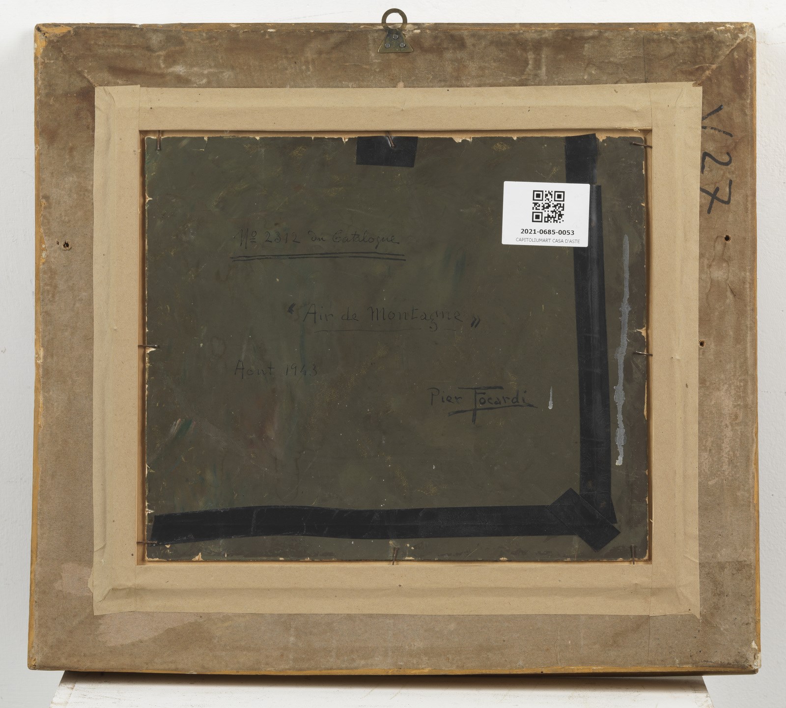 FOCARDI PIERO (1889 - 1945) Air de montagne. Olio su cartone pressato. Cm 33,00 x 28,00. Firmato in basso a destra. Al retro intitolato, firmato e datato 1943. . Cornice presente