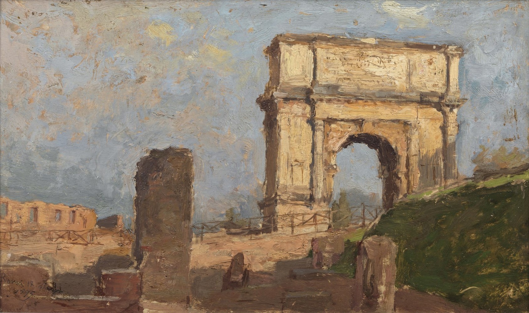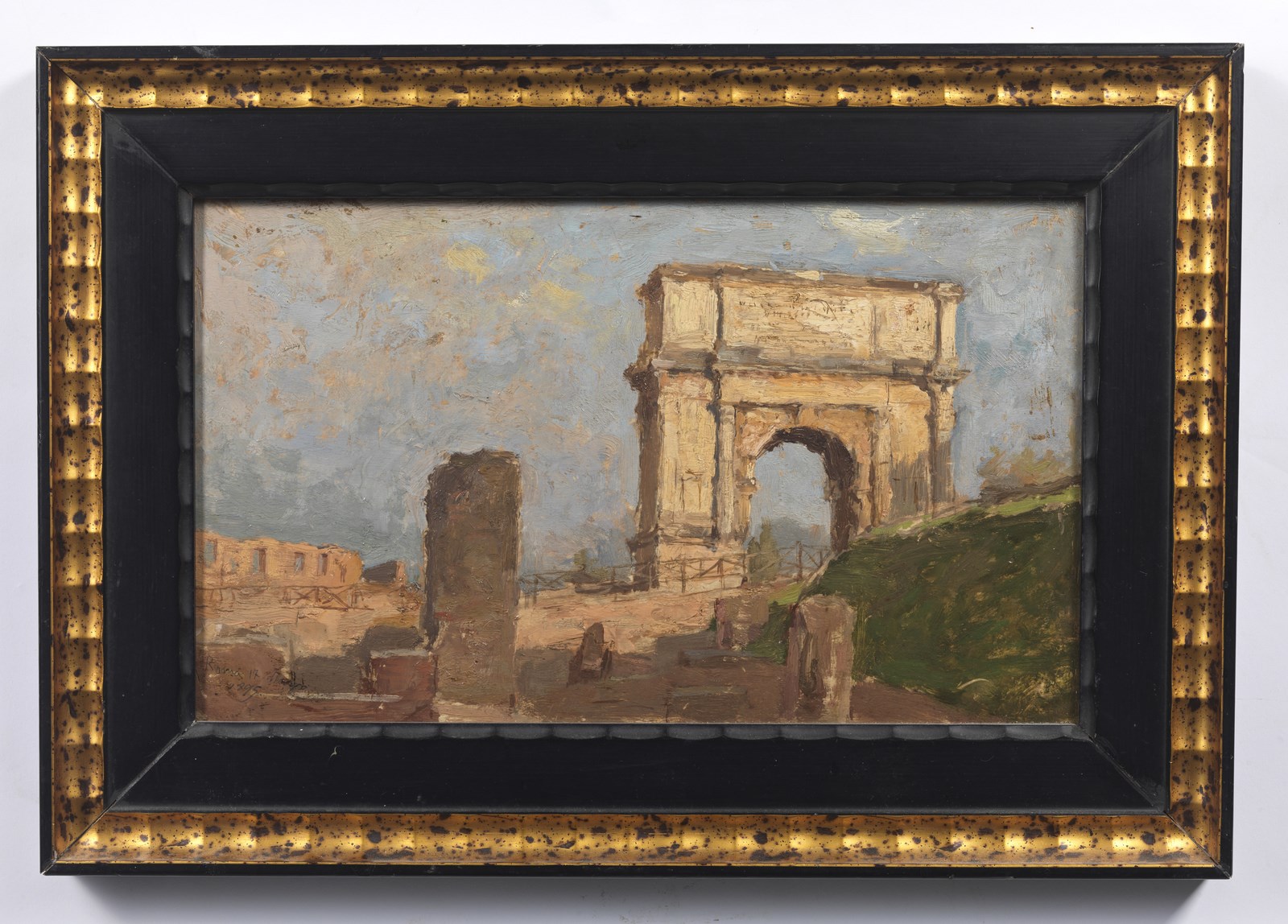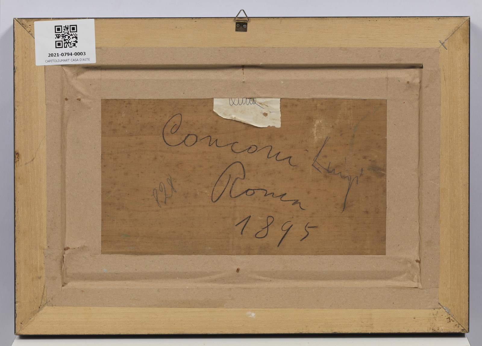 CONCONI LUIGI (1852 - 1917) Paesaggio romano. Olio su tavoletta. Cm 31,00 x 19,00. Datato 1895 in basso a sinistra. Al retro firmato e datato. . Cornice presente