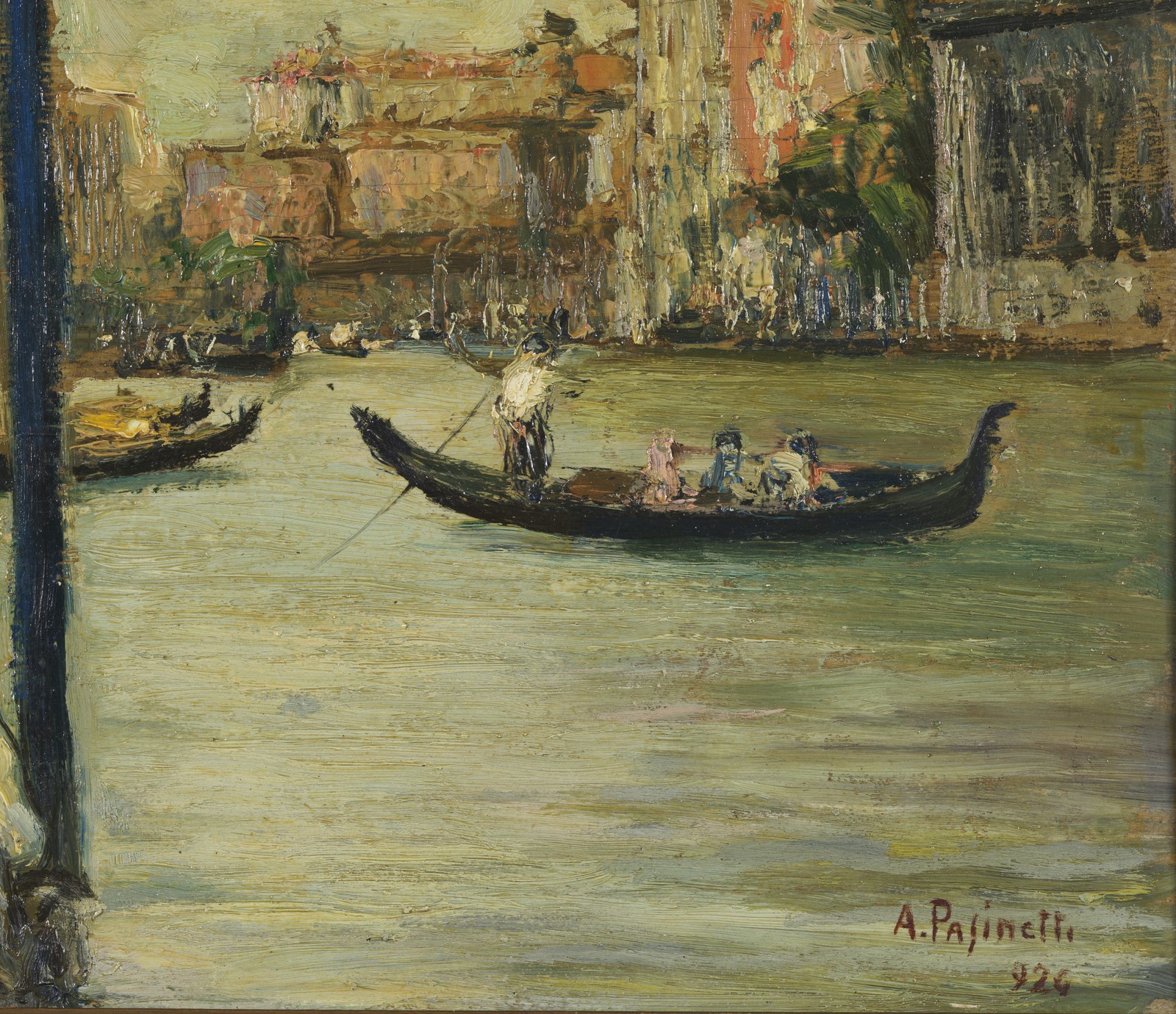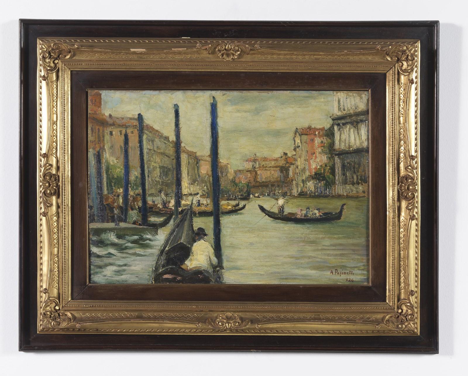 PASINETTI ANTONIO (1863 - 1940) Venezia, Canal Grande. Olio su tavola. Cm 50,00 x 35,00. Firmato e datato 1926 in basso a destra. Al retro cartiglio descrittivo XV esposizione internazionale, Venezia 1926; cartiglio descrittivo Società per le belle arti ed esposizione permanente, Milano.