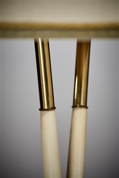 Floor lamp with Y-shaped stem. Milan, 1940s. White varnished wood, brass, lenticular base in Carrara statuary marble, fabric lampshade. (h 170 cm.) (slight defects)