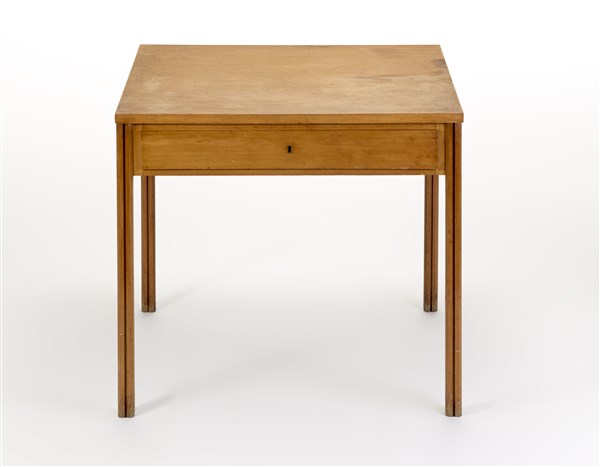 Tavolo con piano quadrato. Italia, anni '50. Struttura in legno chiaro massello, bordato e impiallacciato, quattro gambe a sezione ottagonale scanalata, un cassetto sottopiano. (cm 90,5x80x90,5) (difetti)