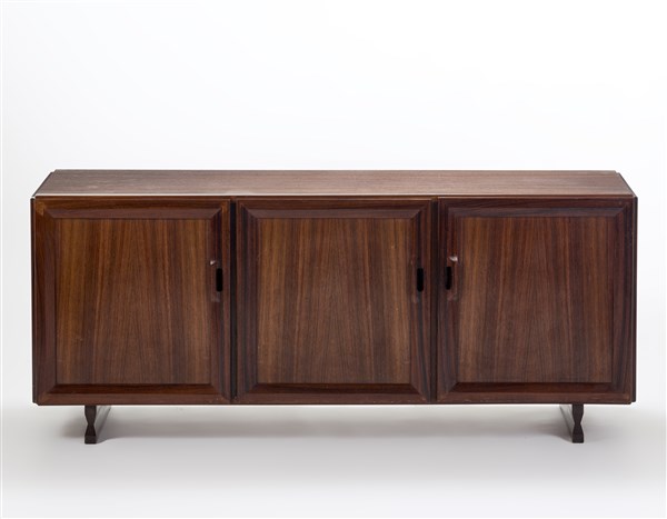 Mobile contenitore a tre ante modello "MB15". Esecuzione Poggi, Pavia, 1958. Legno massello impiallacciato e bordato. (cm 183x77x47) (lievi difetti)
