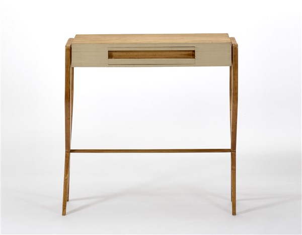 Consolle con montanti a forcella a X uniti da una traversa orizzontale, fronte a un cassetto grissinato e laccato bianco. Milano, anni '40/'50. Legno massello e impiallacciato di acero. (cm 100x98,5x35) (lievi difetti e restauri)
